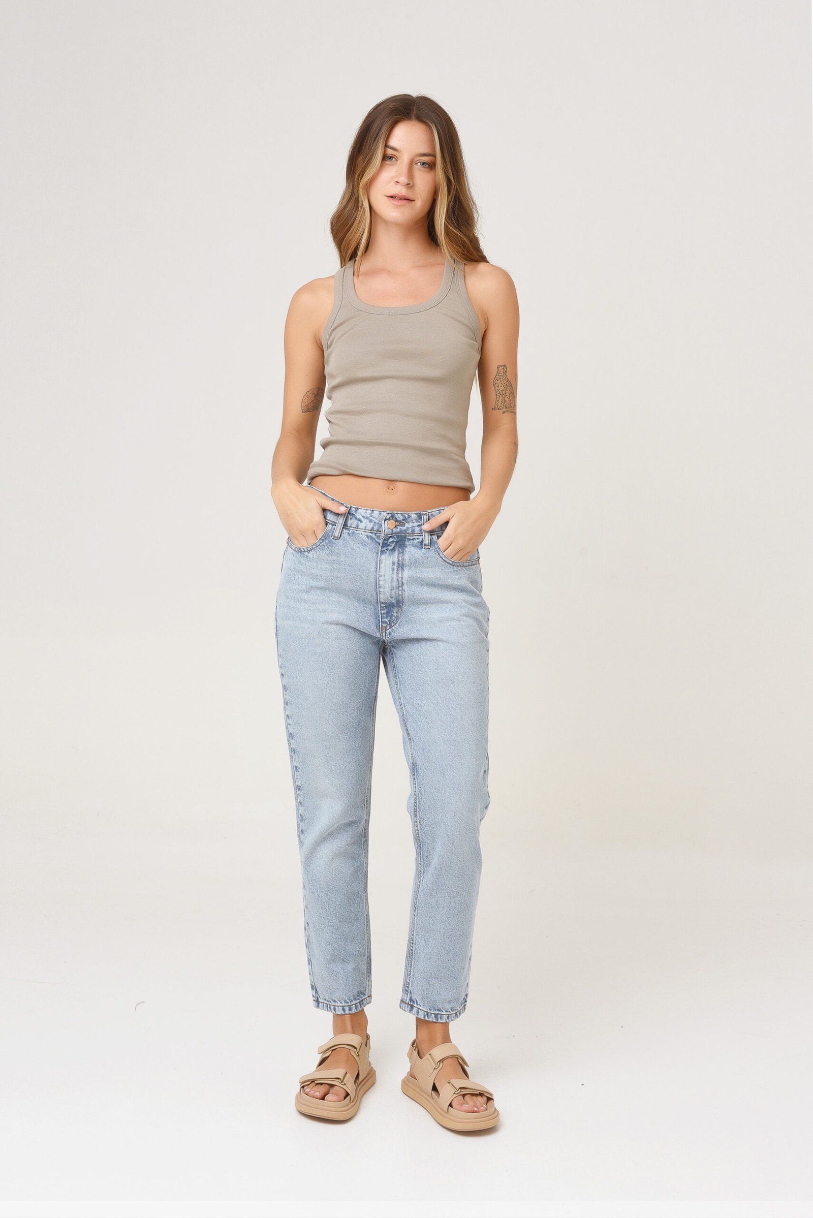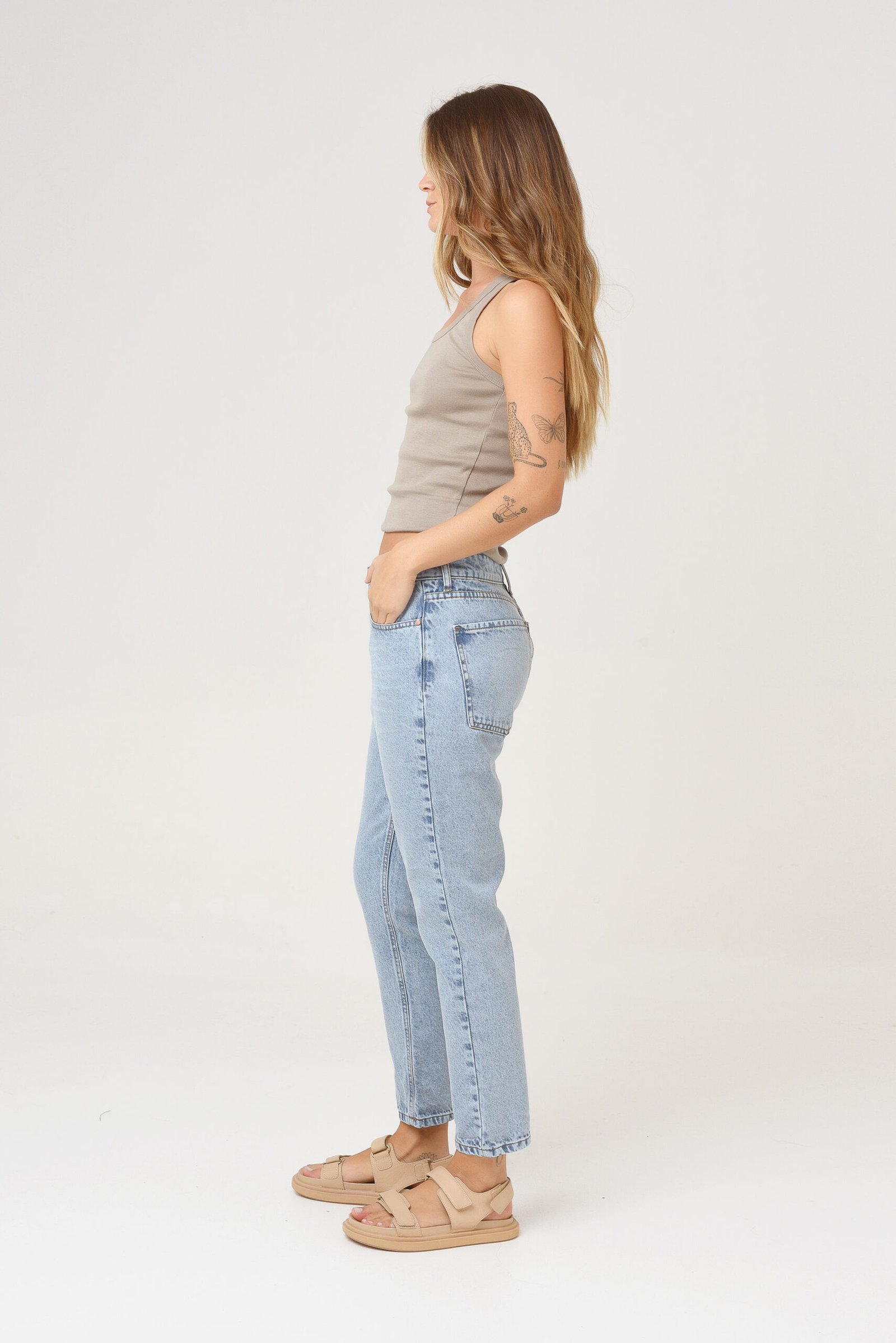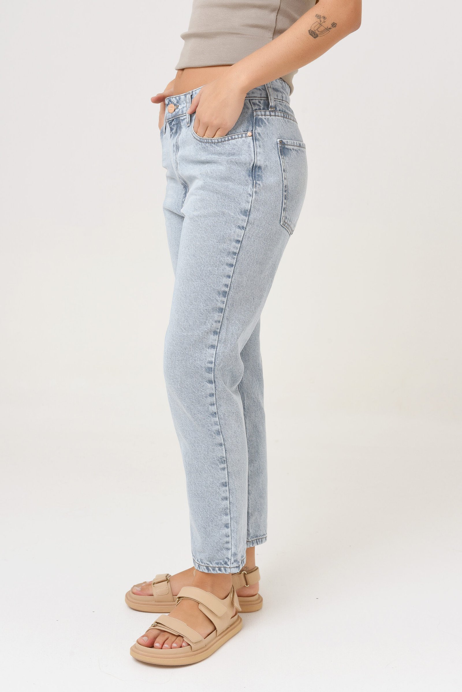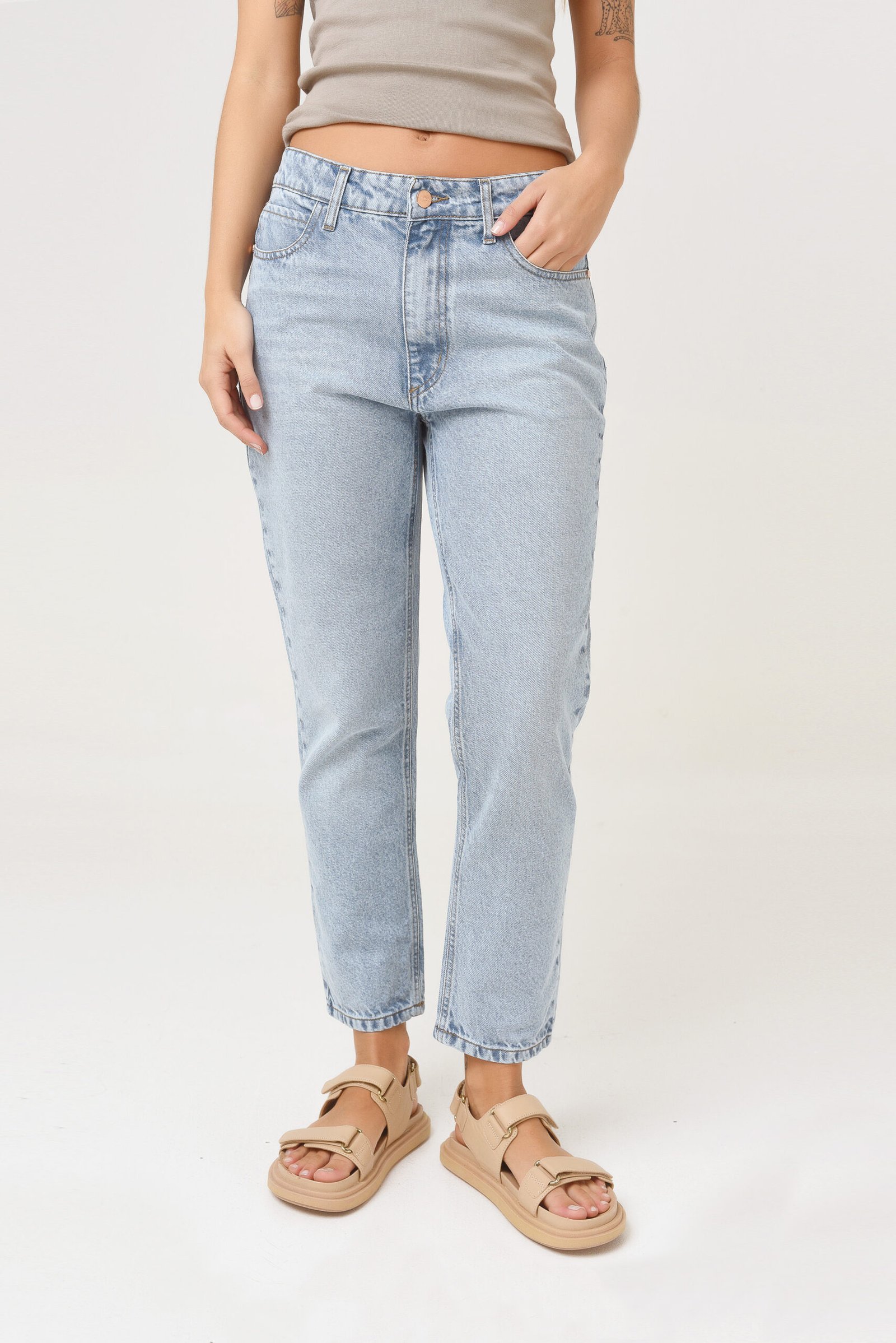 Tiro medio, ajuste en cadera y muslos. Leve holguera en piernas.