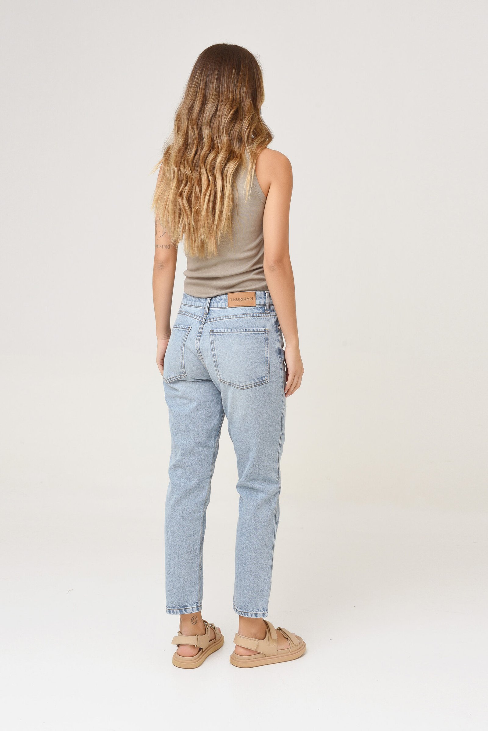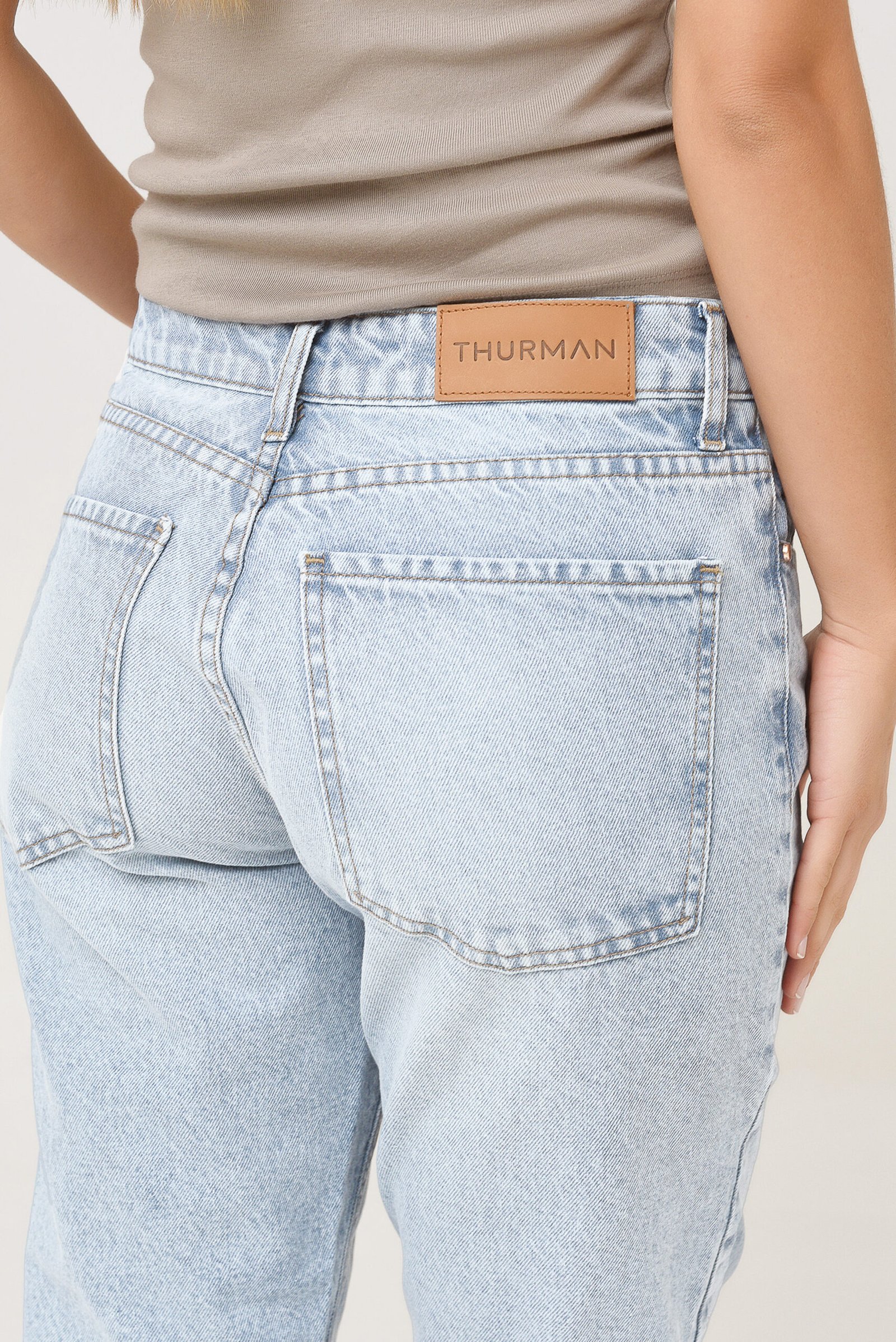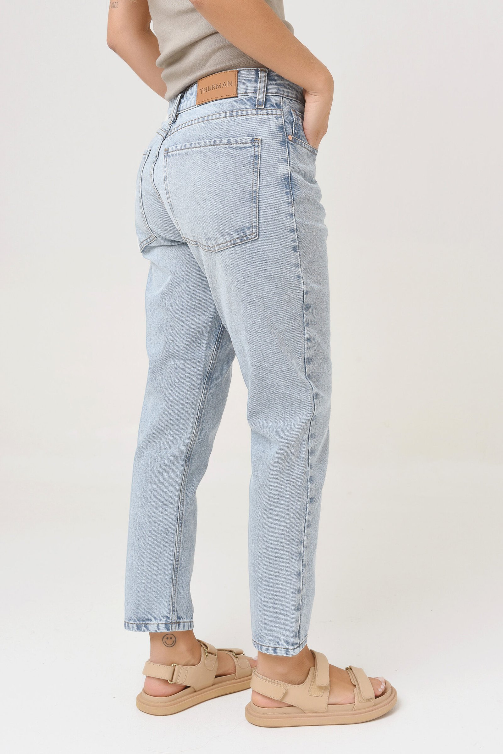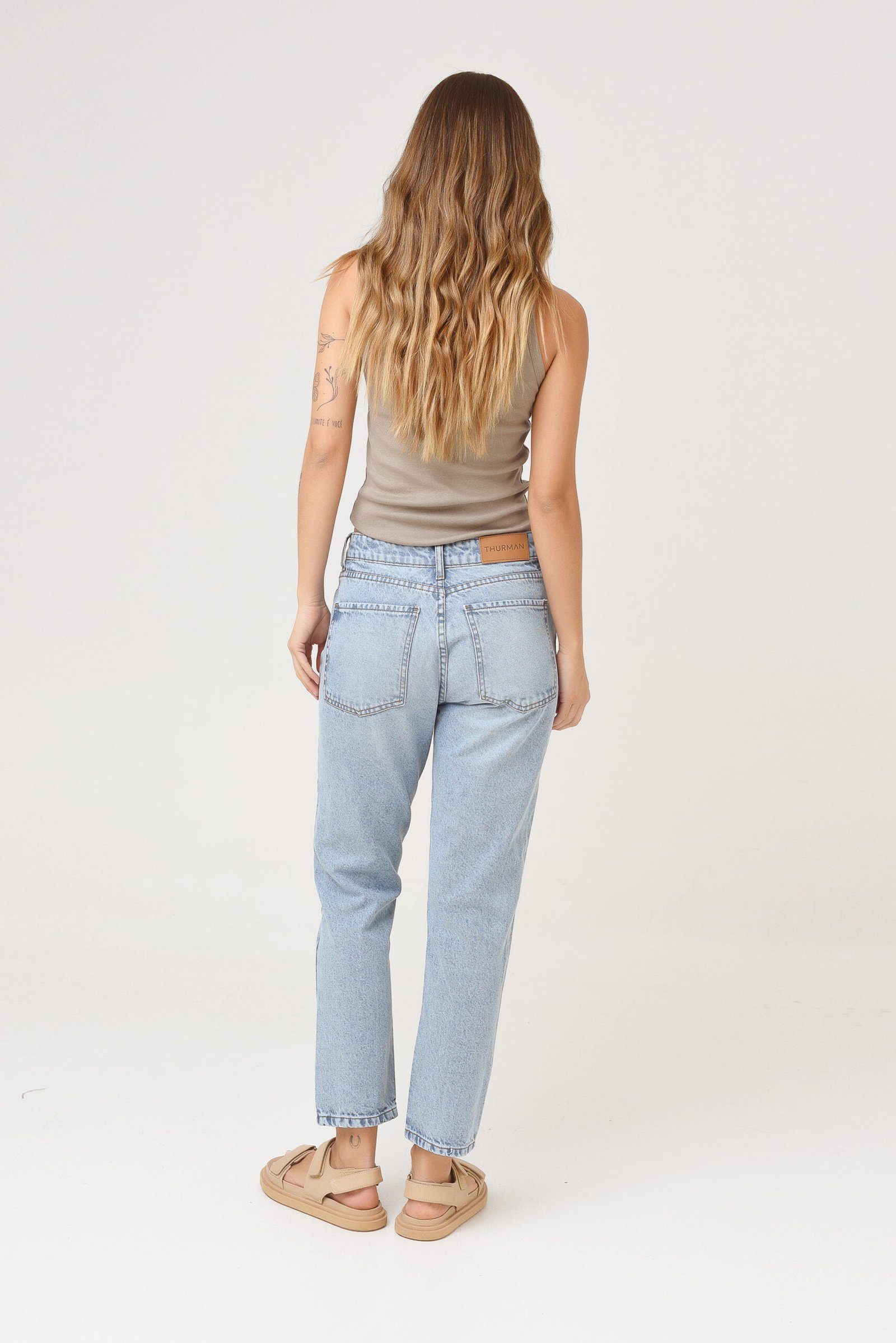 Tiro medio, ajuste en cadera y muslos. Leve holguera en piernas.