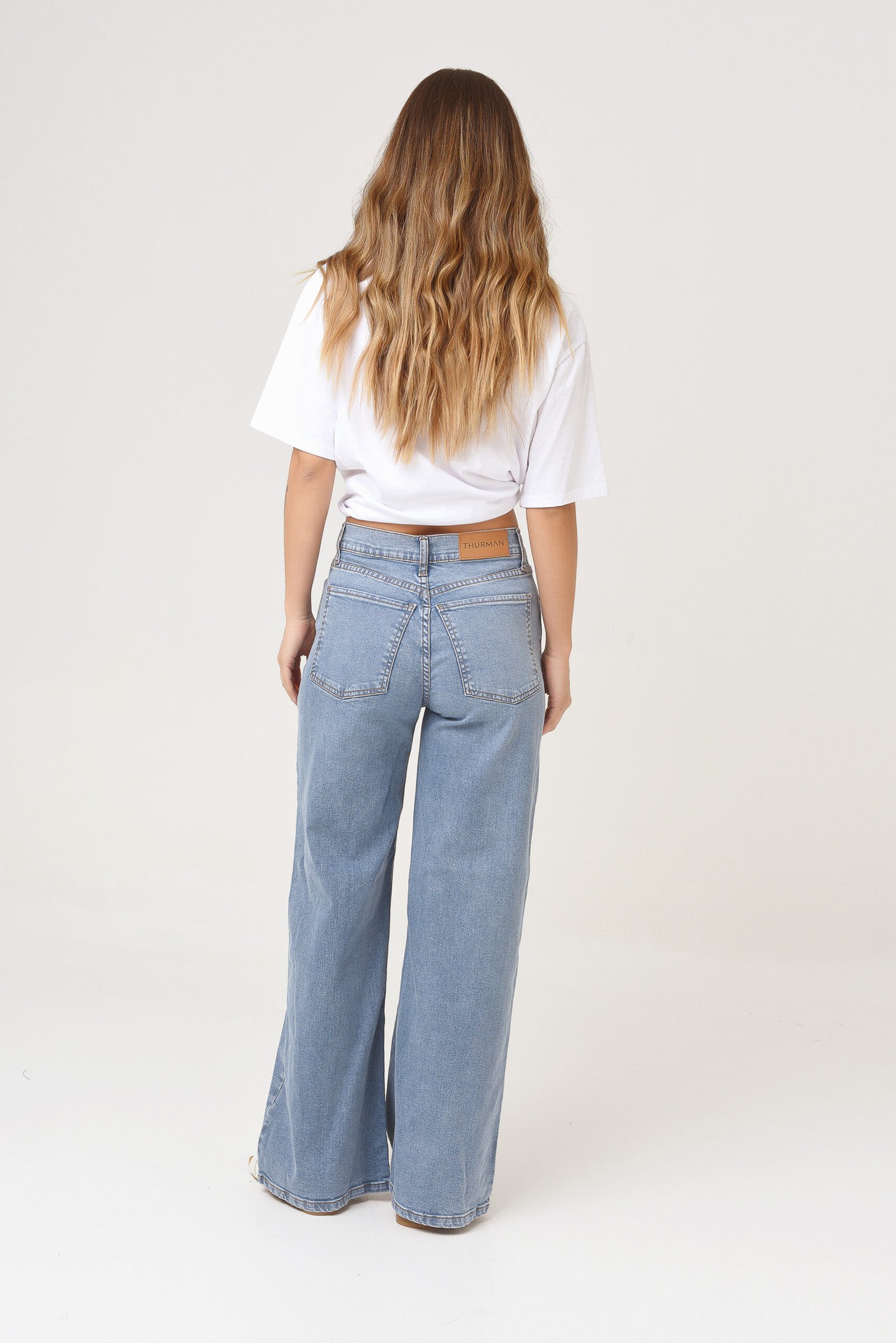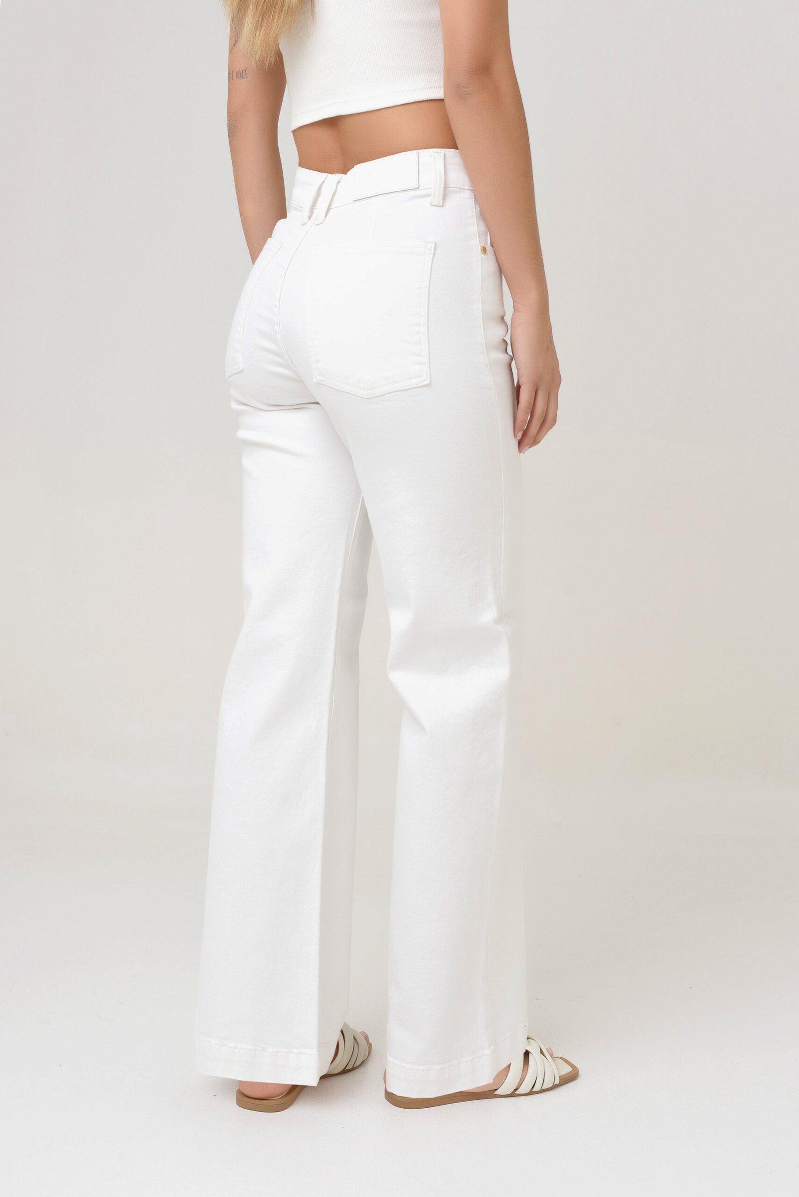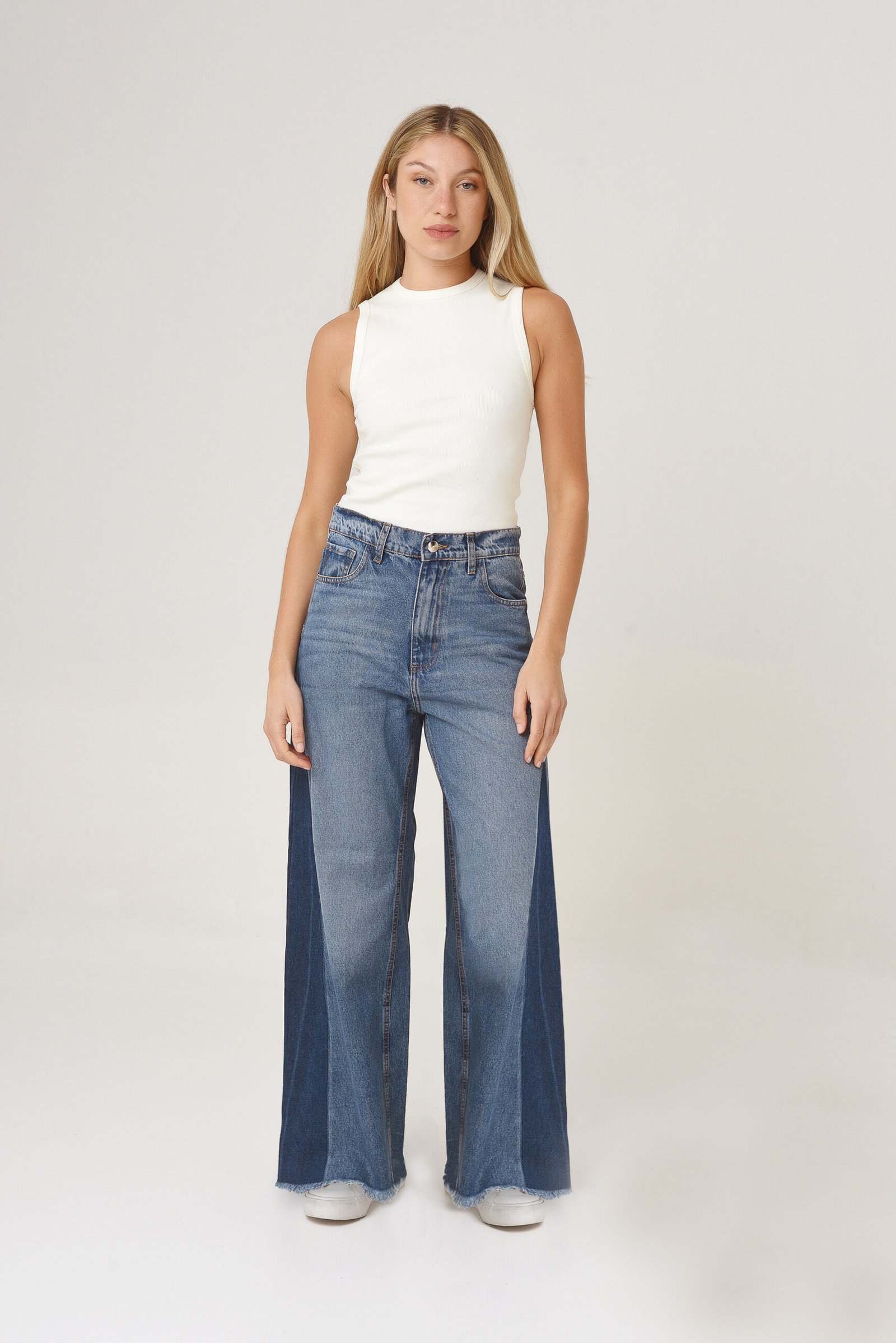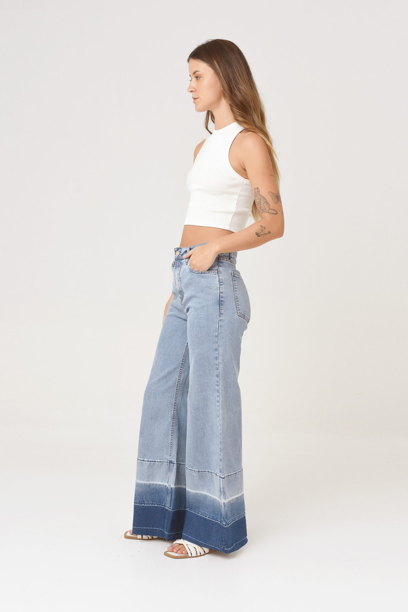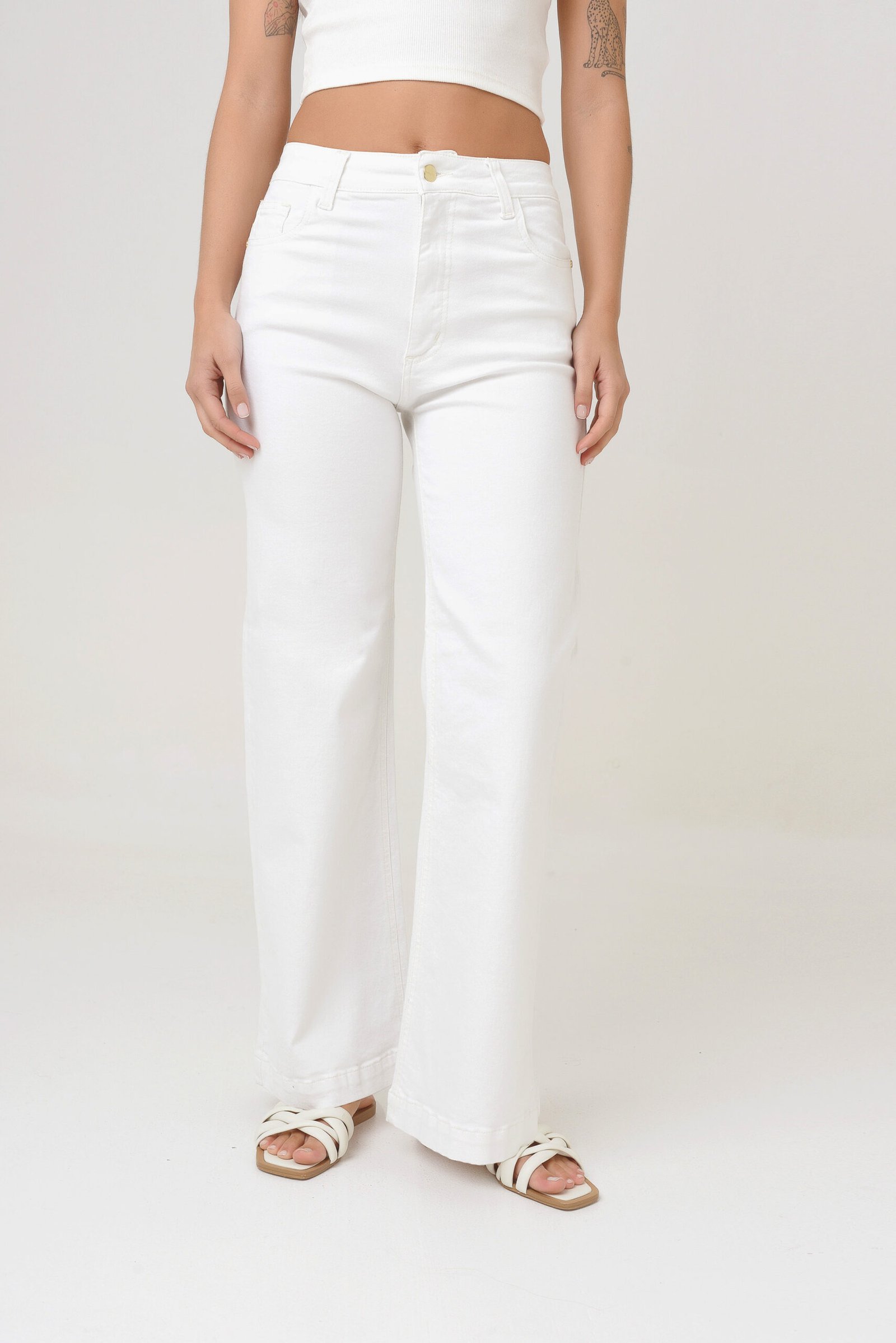 Tiro alto, ajuste en cintura, cadera y muslos. Pierna ancha de muslo a botamanga.