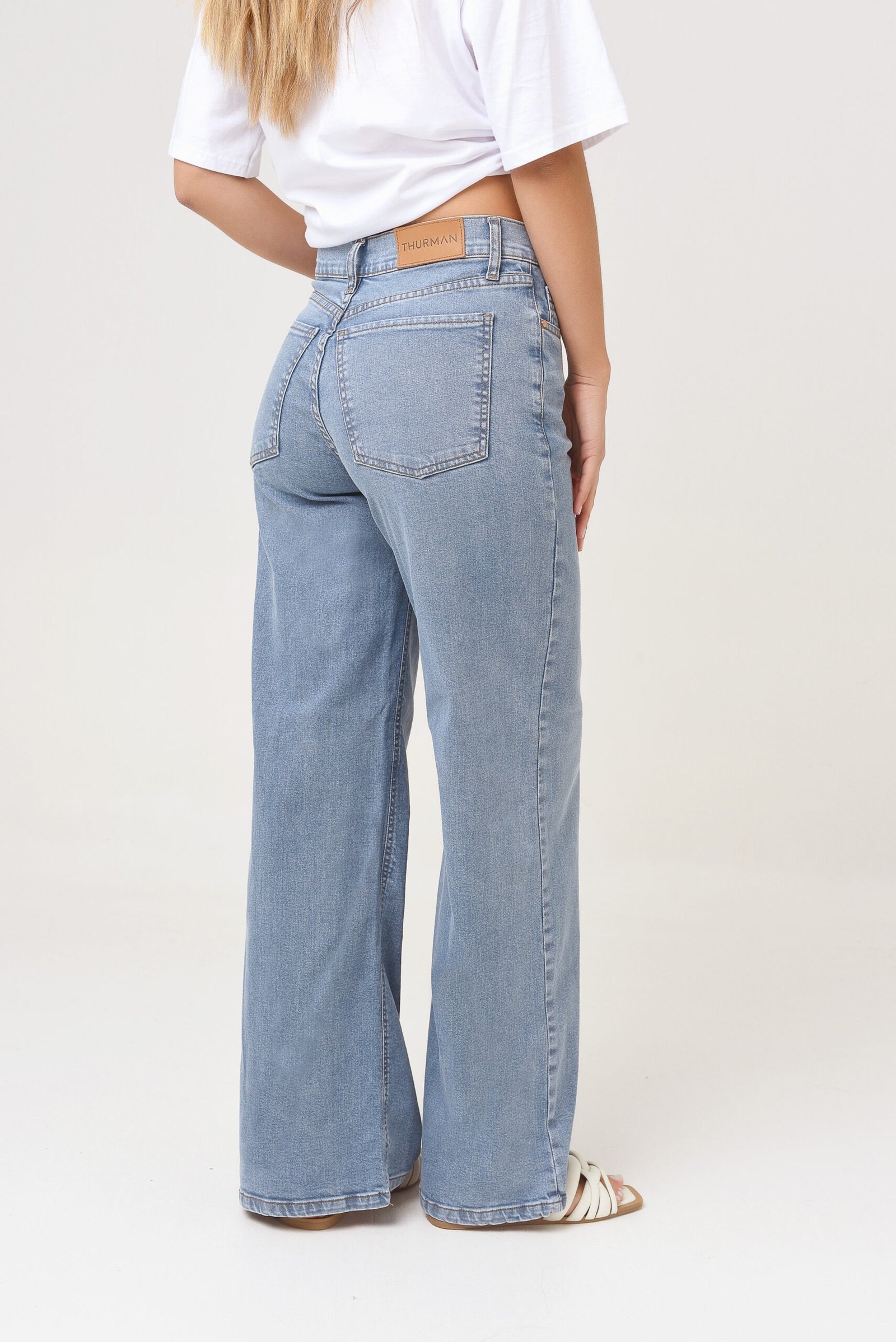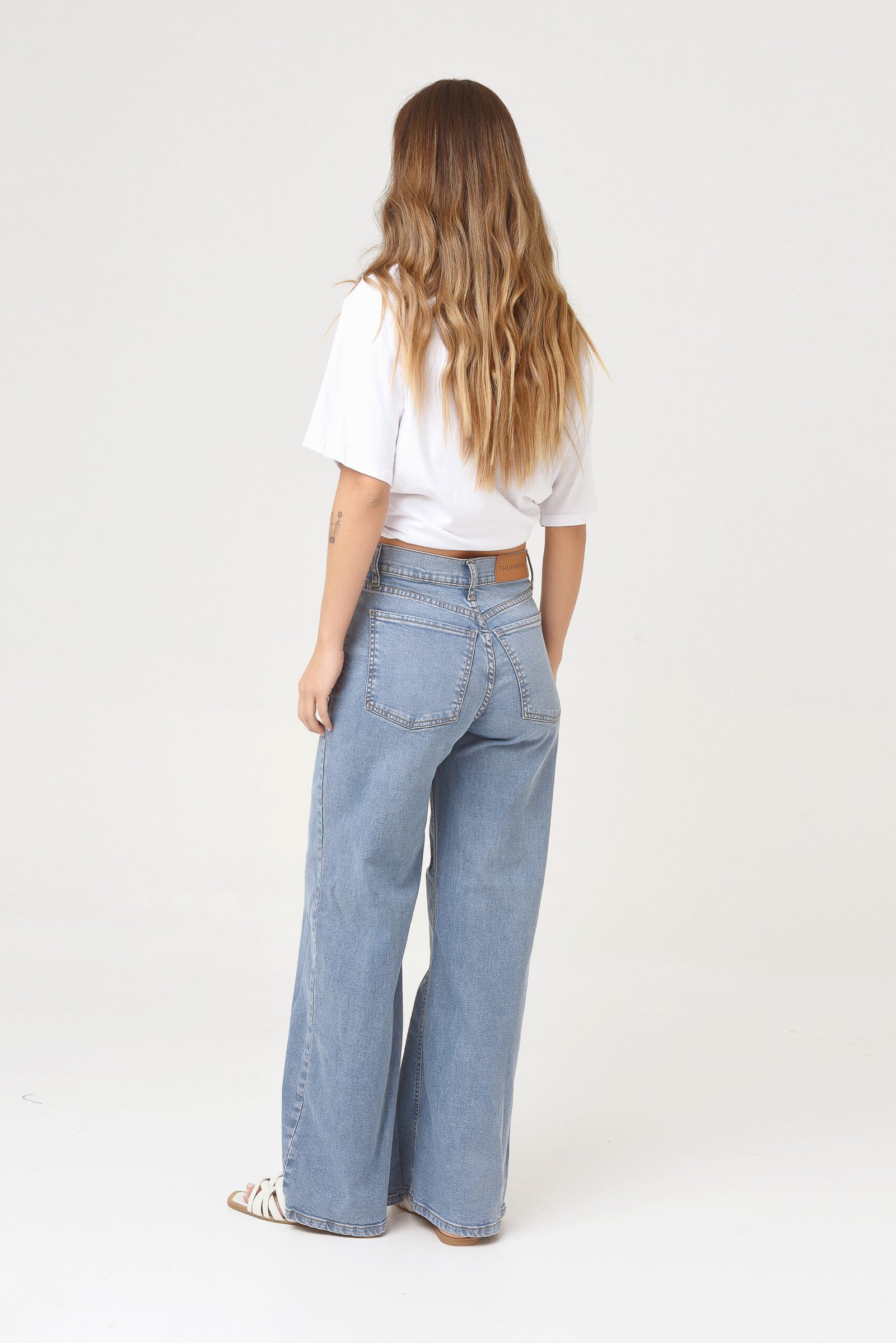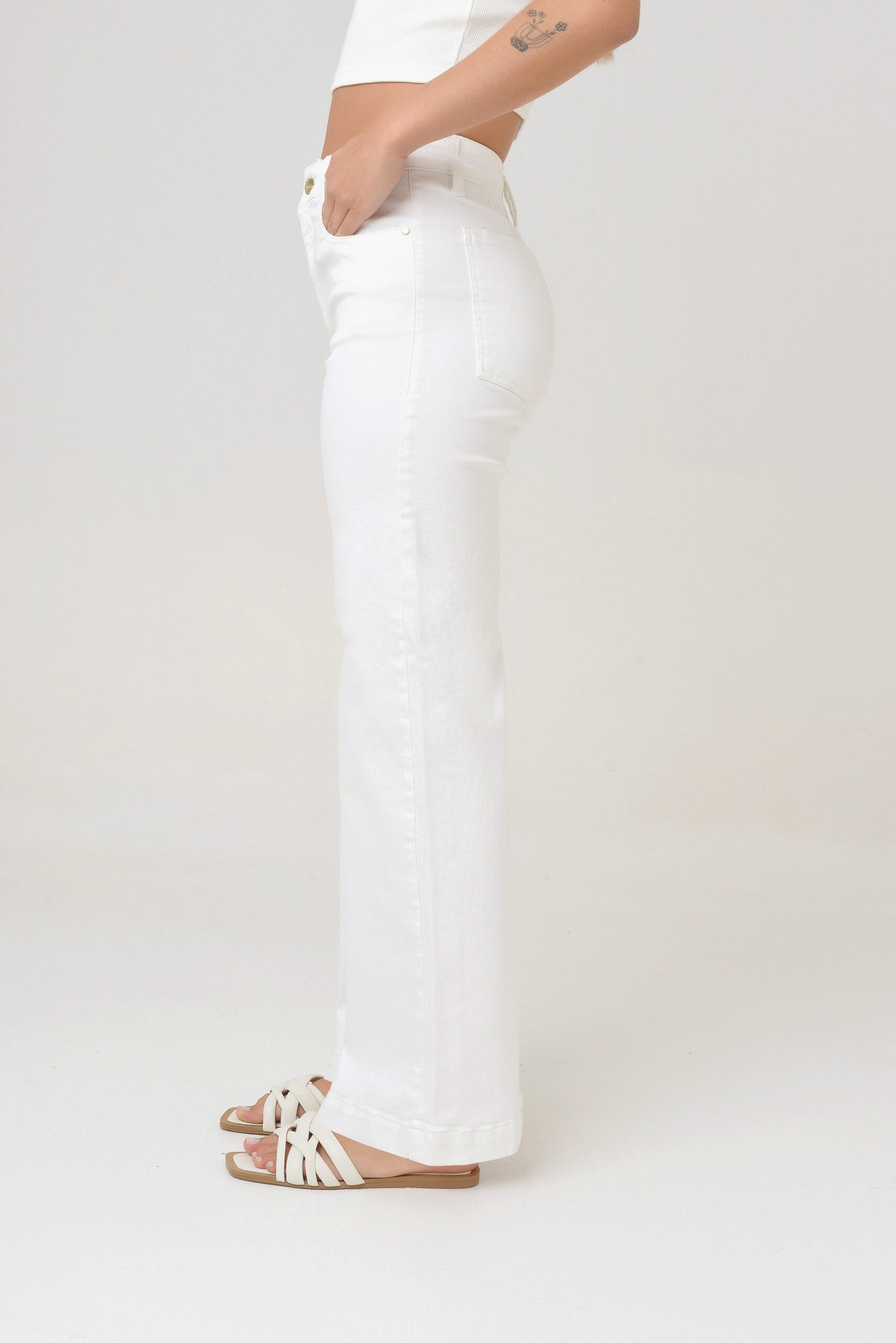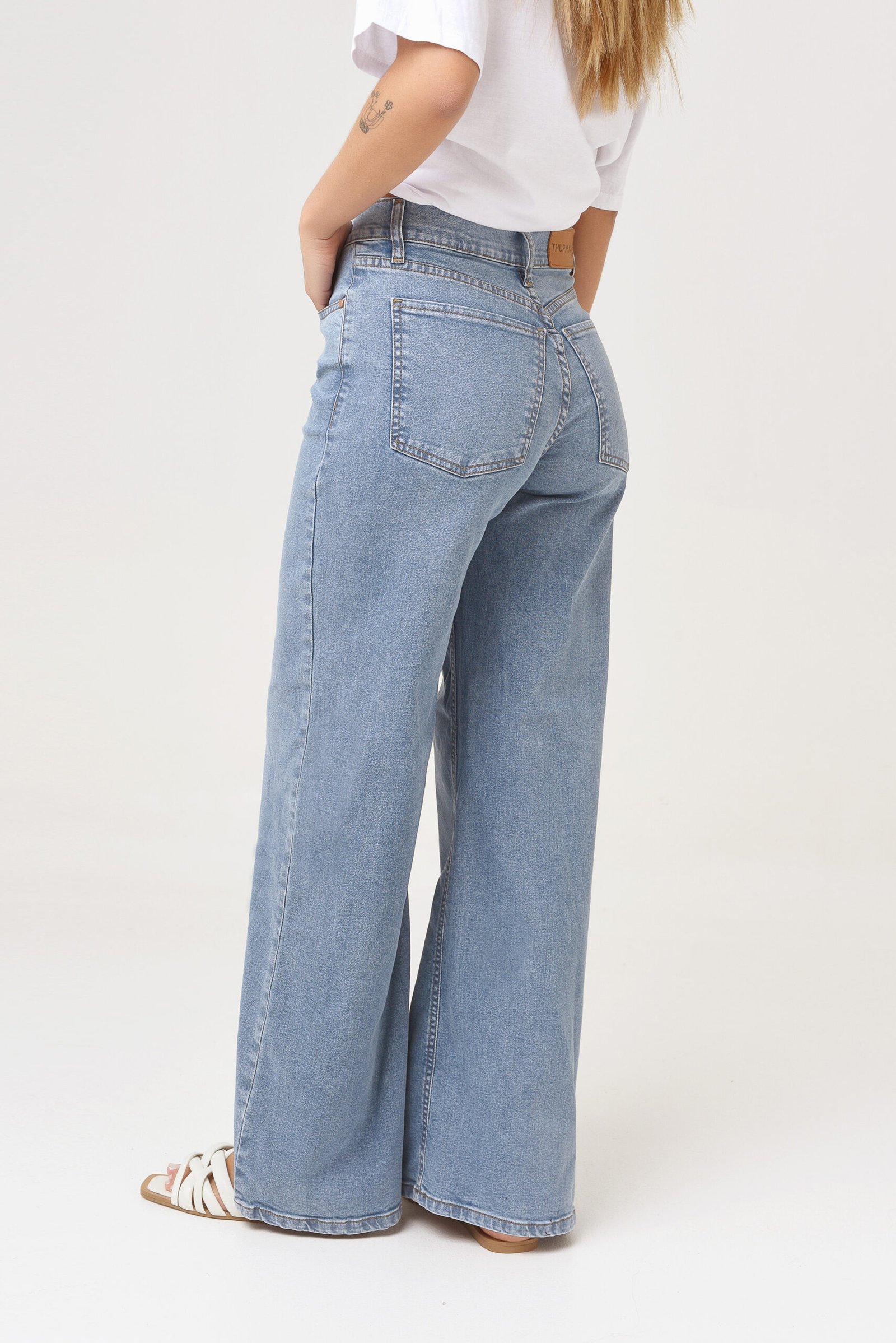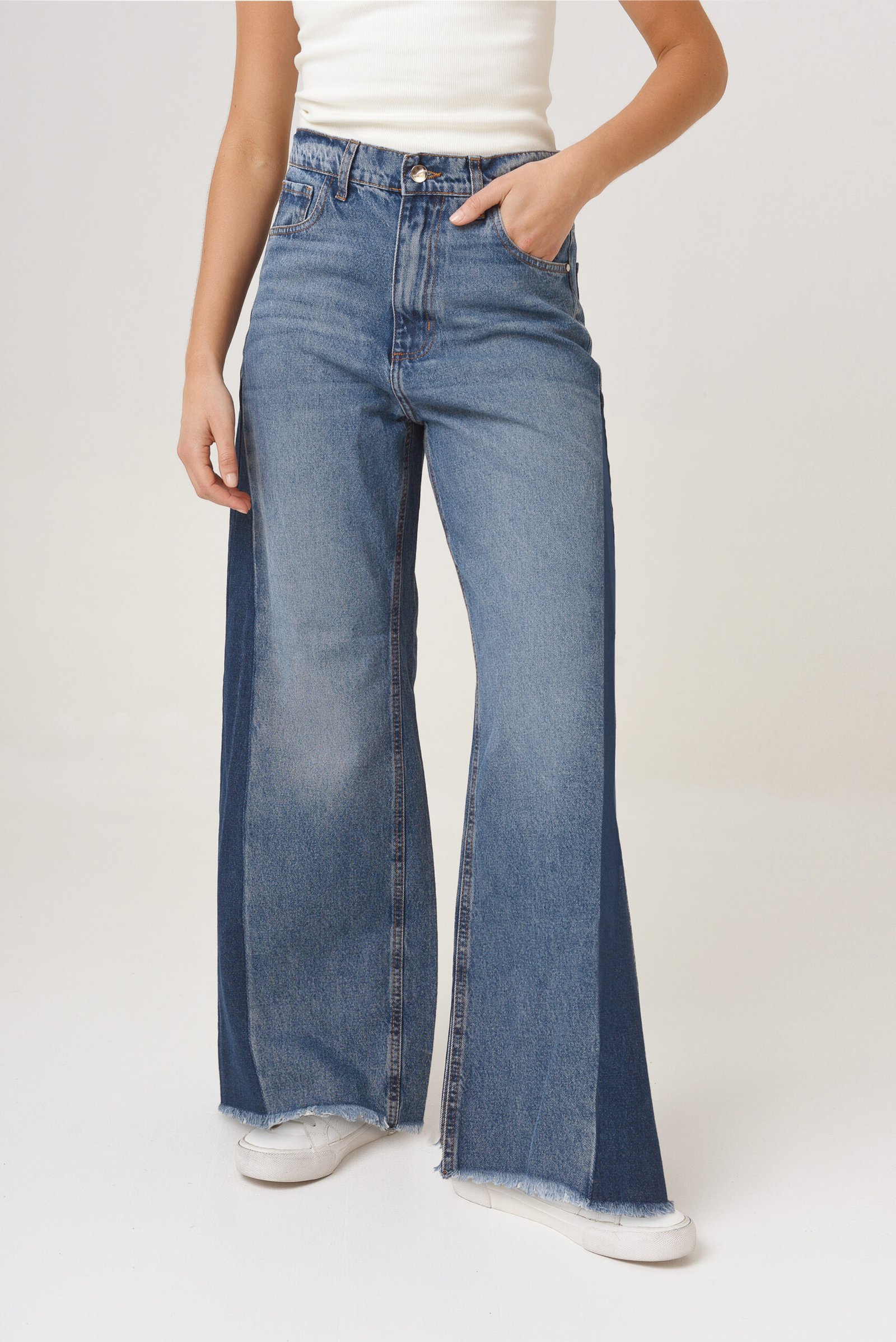 Tiro alto, ajuste en cintura, cadera y muslos. Pierna ancha de muslo a botamanga.
