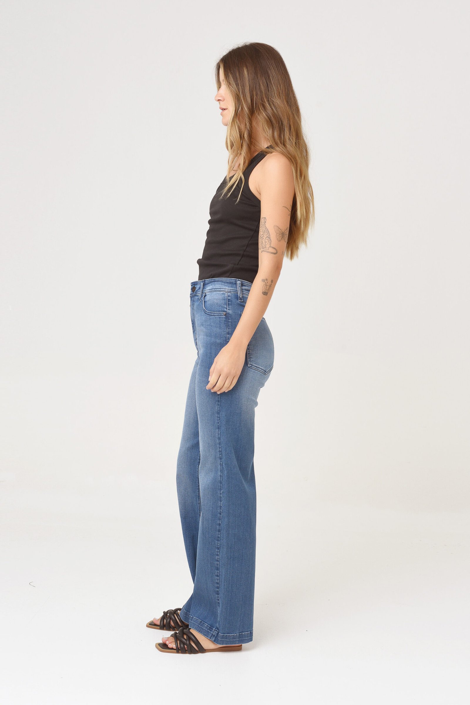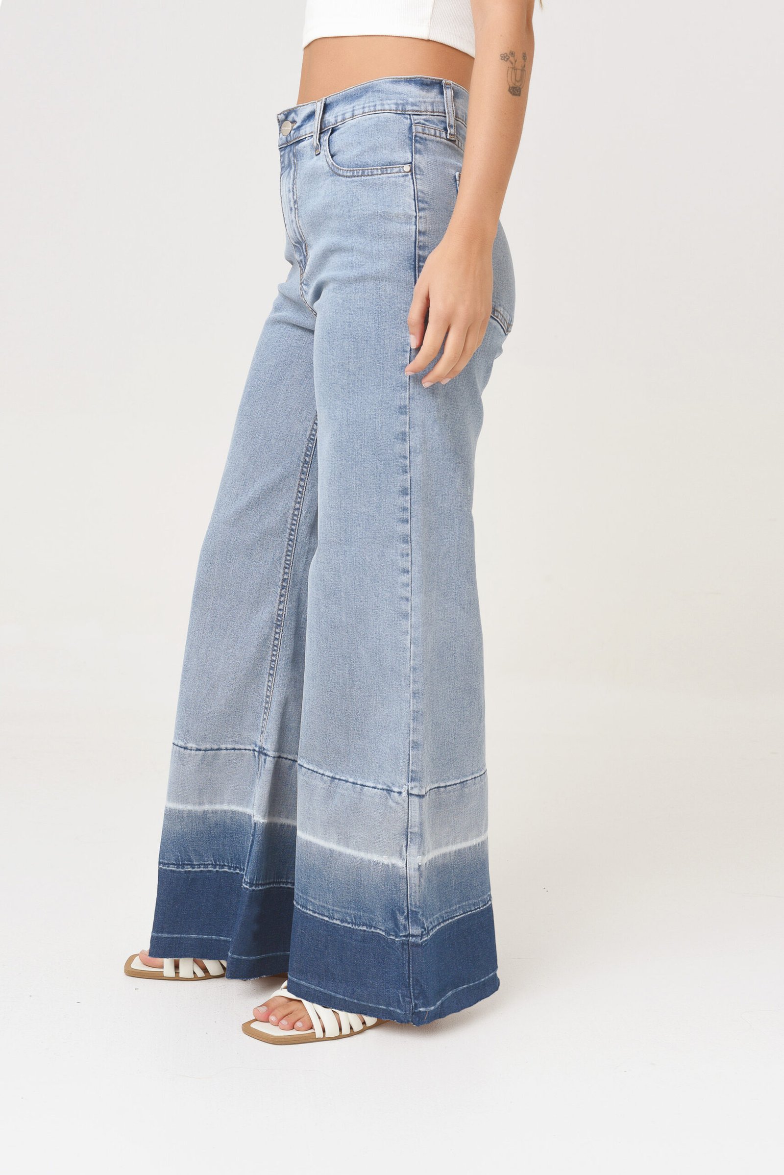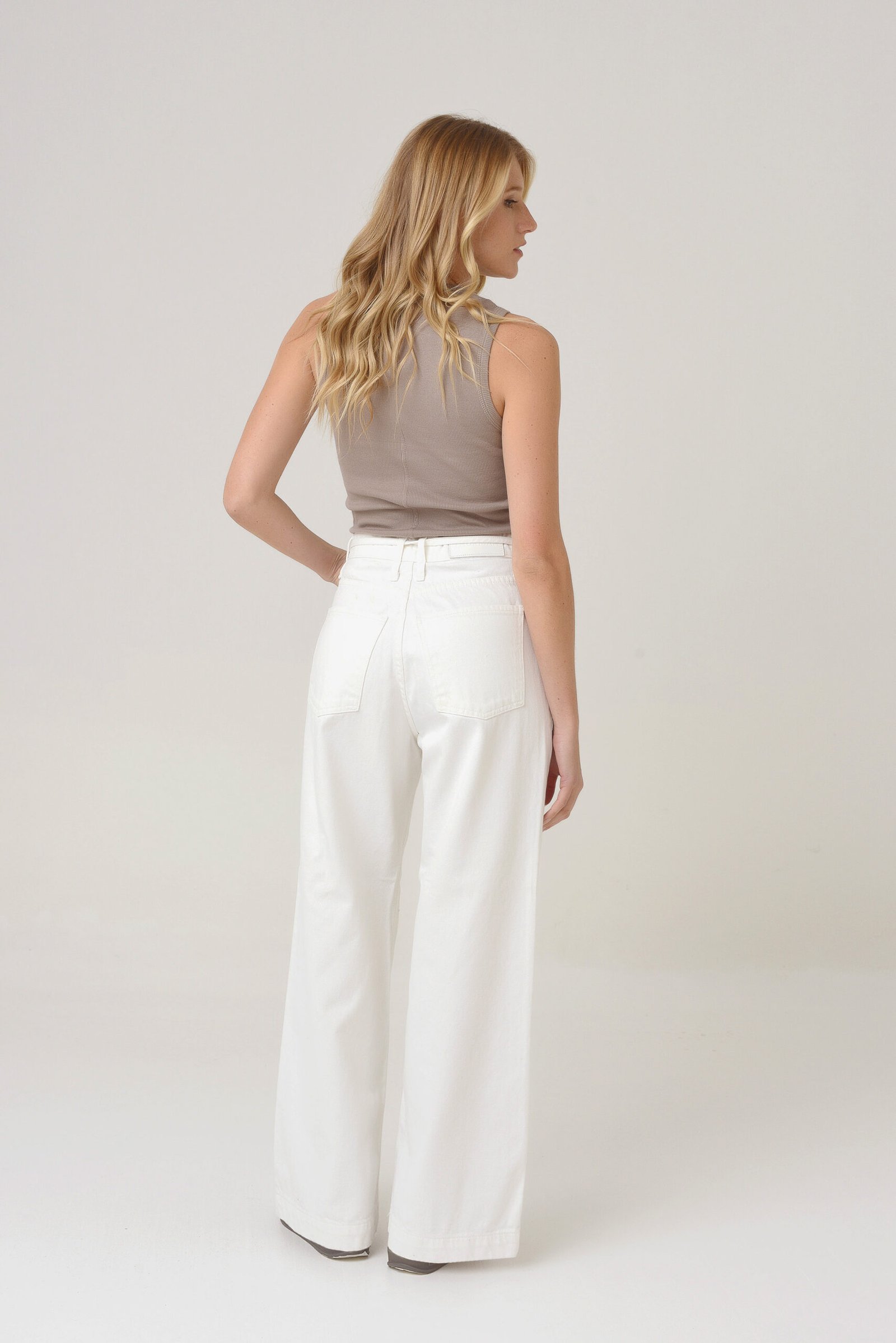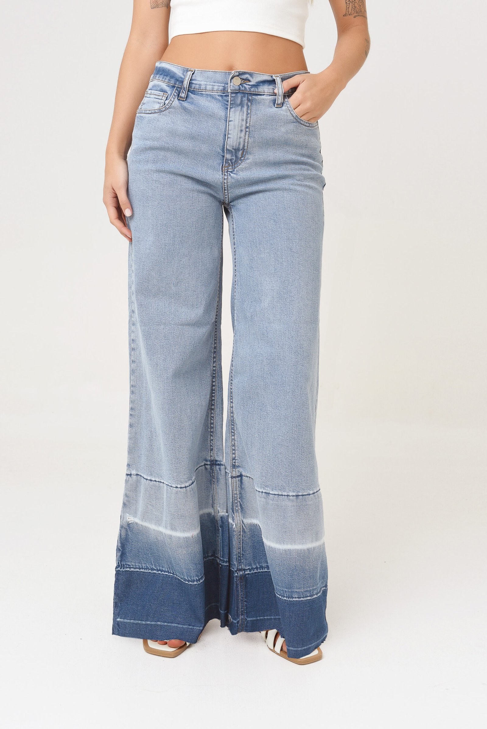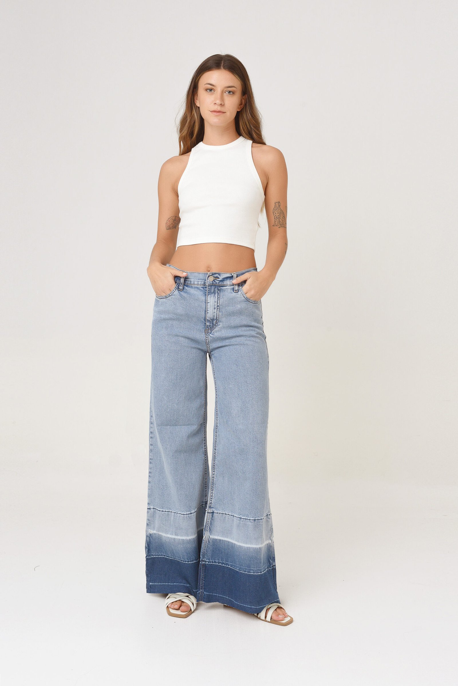 Tiro alto, ajuste en cintura, cadera y muslos. Pierna ancha de muslo a botamanga.
