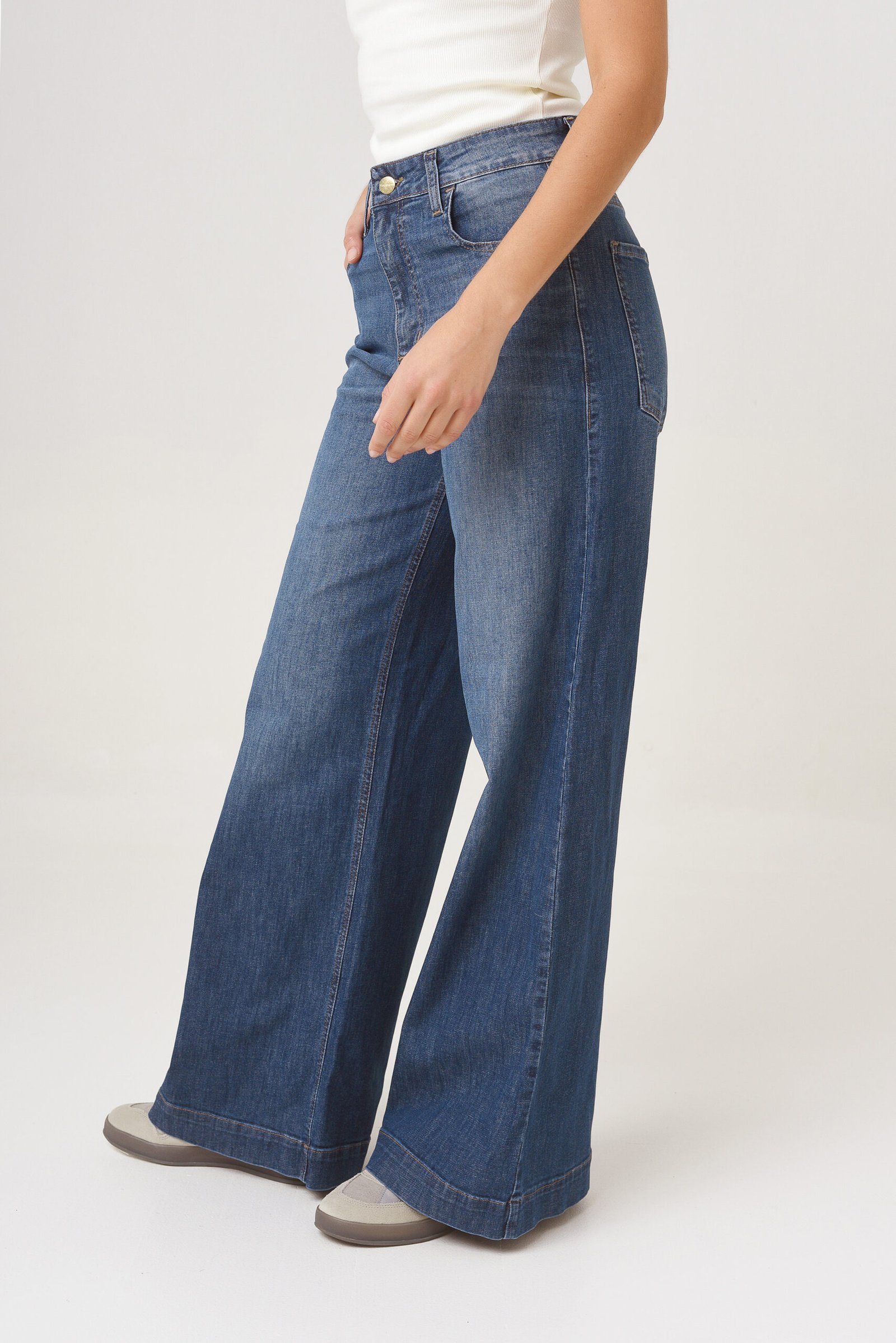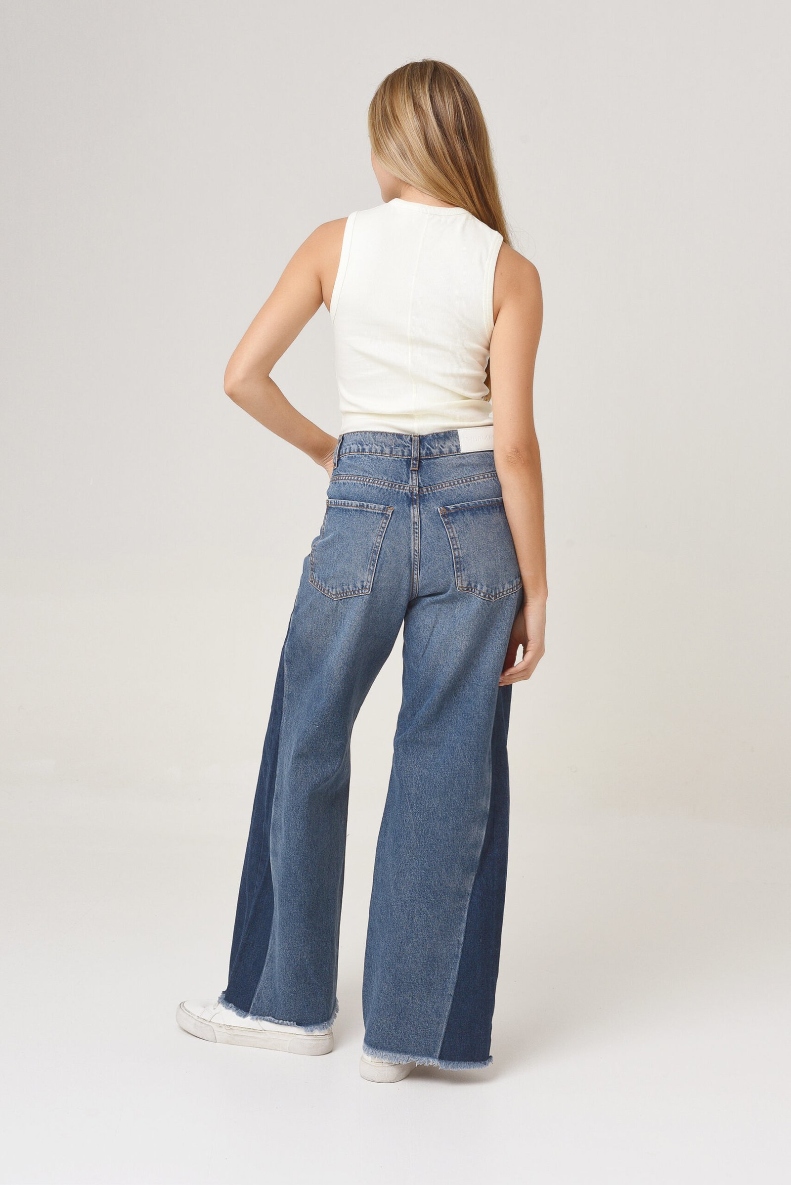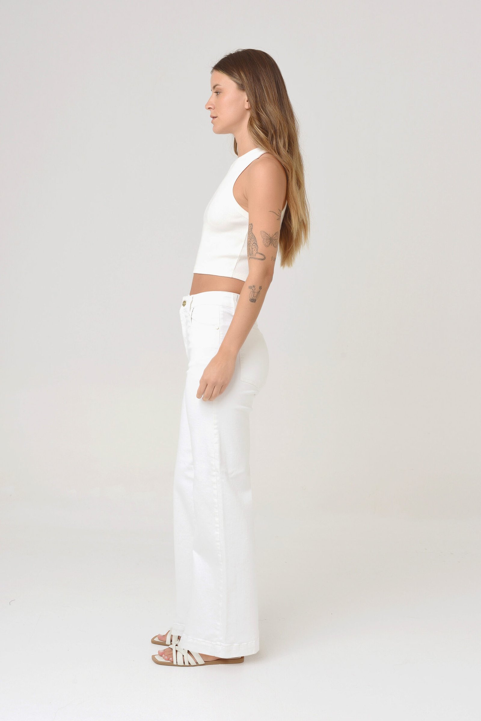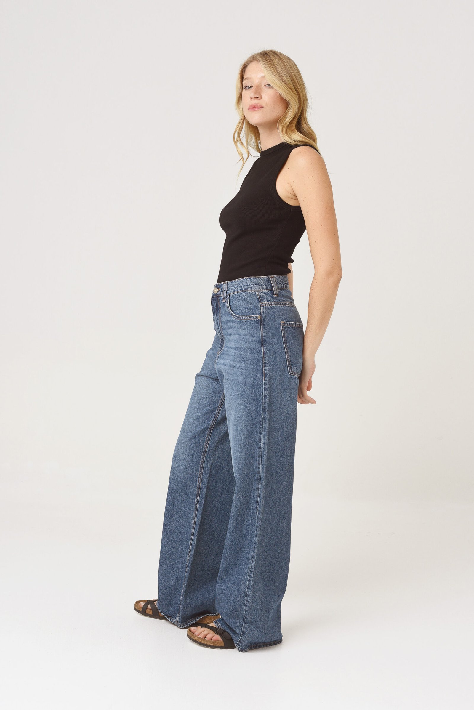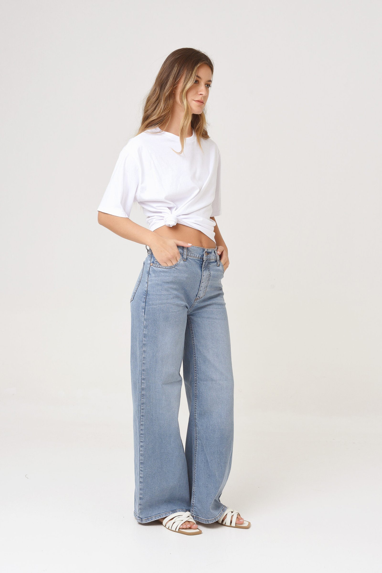 Tiro alto, ajuste en cintura, cadera y muslos. Pierna ancha de muslo a botamanga.