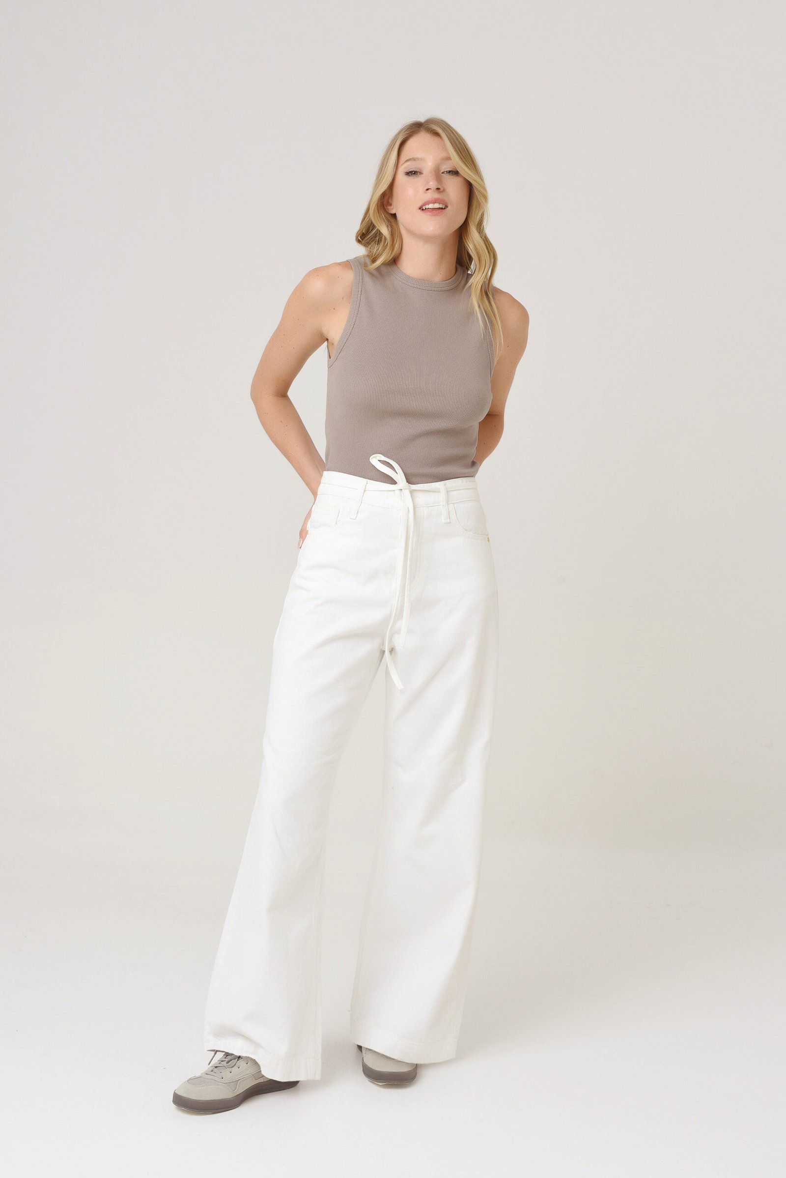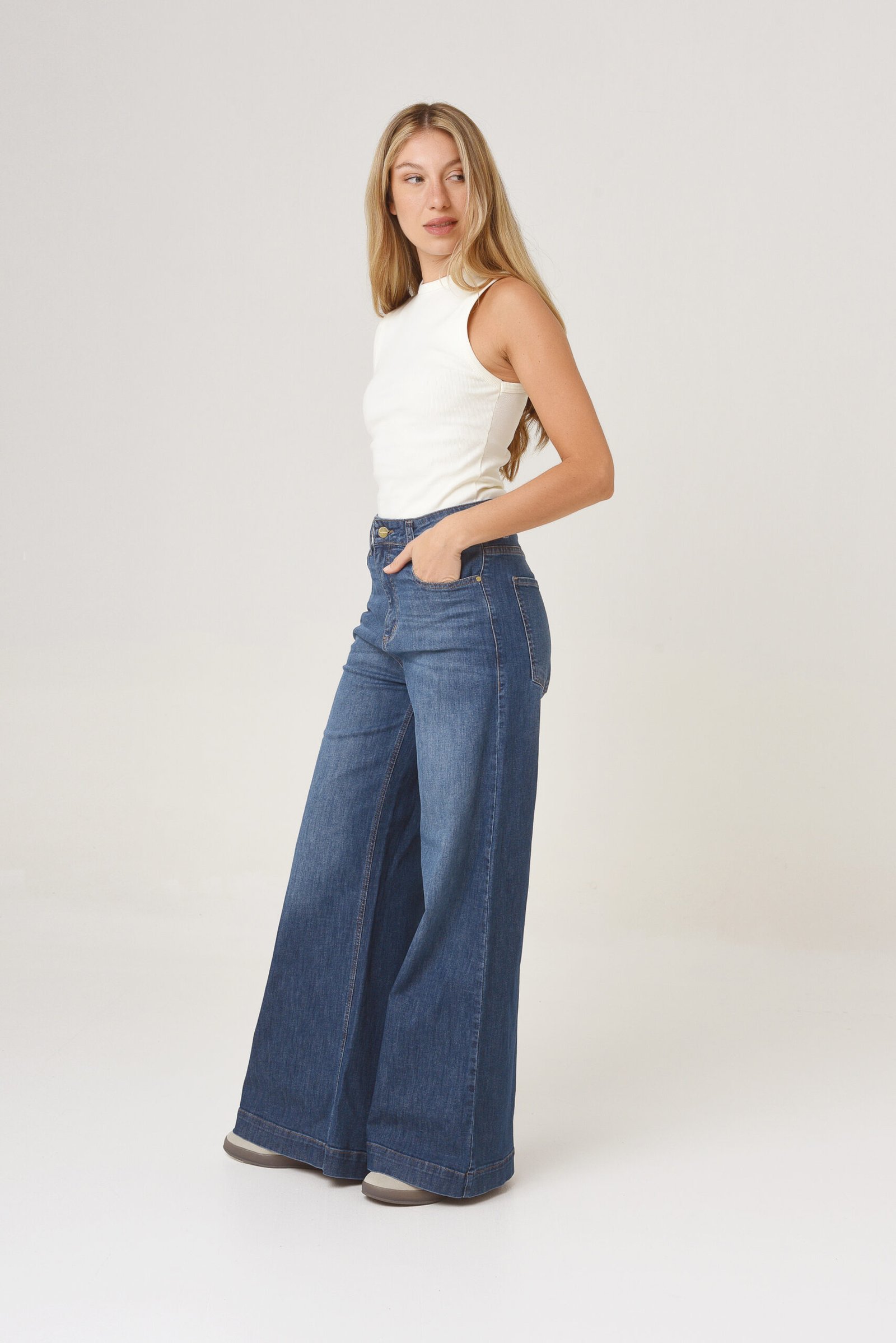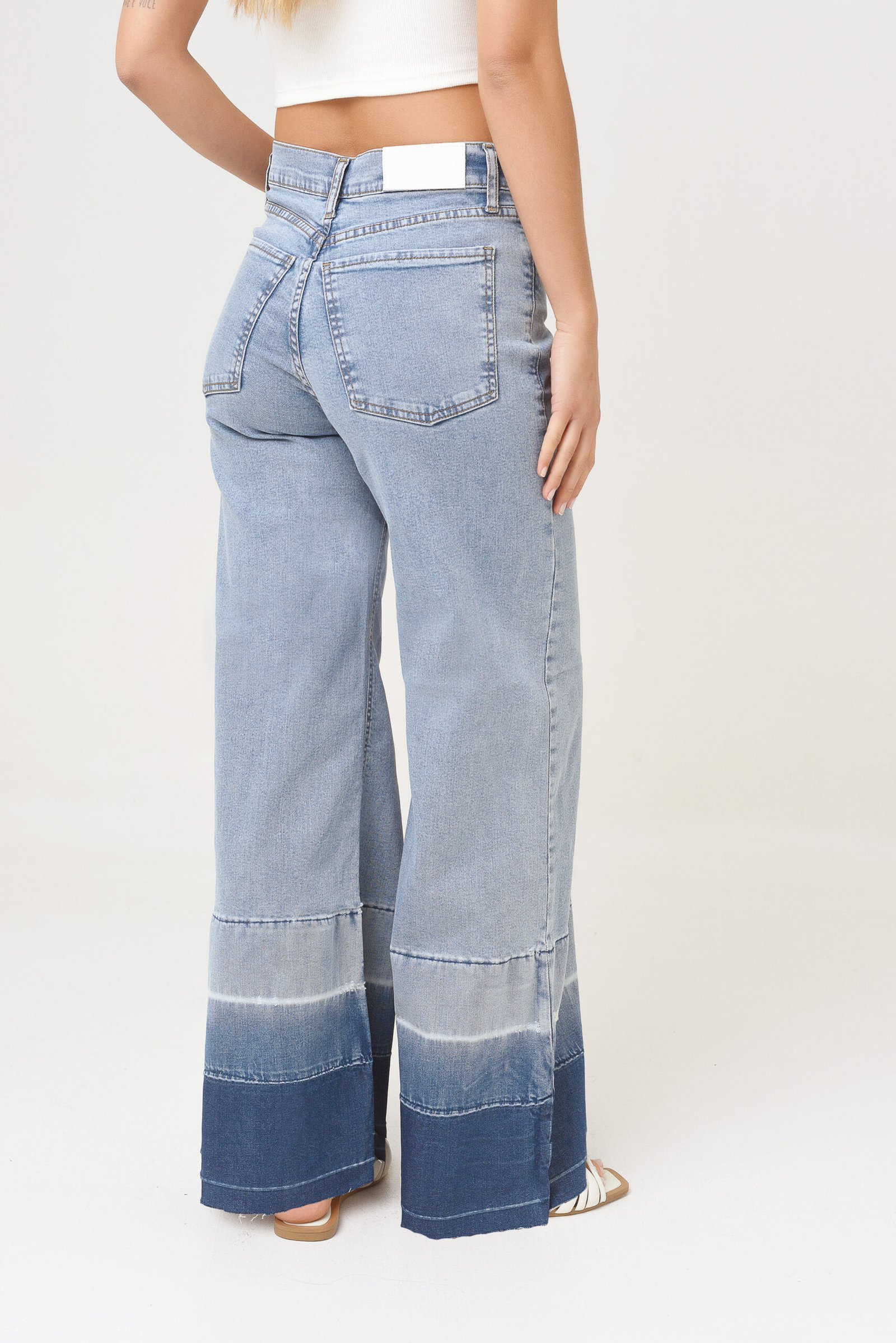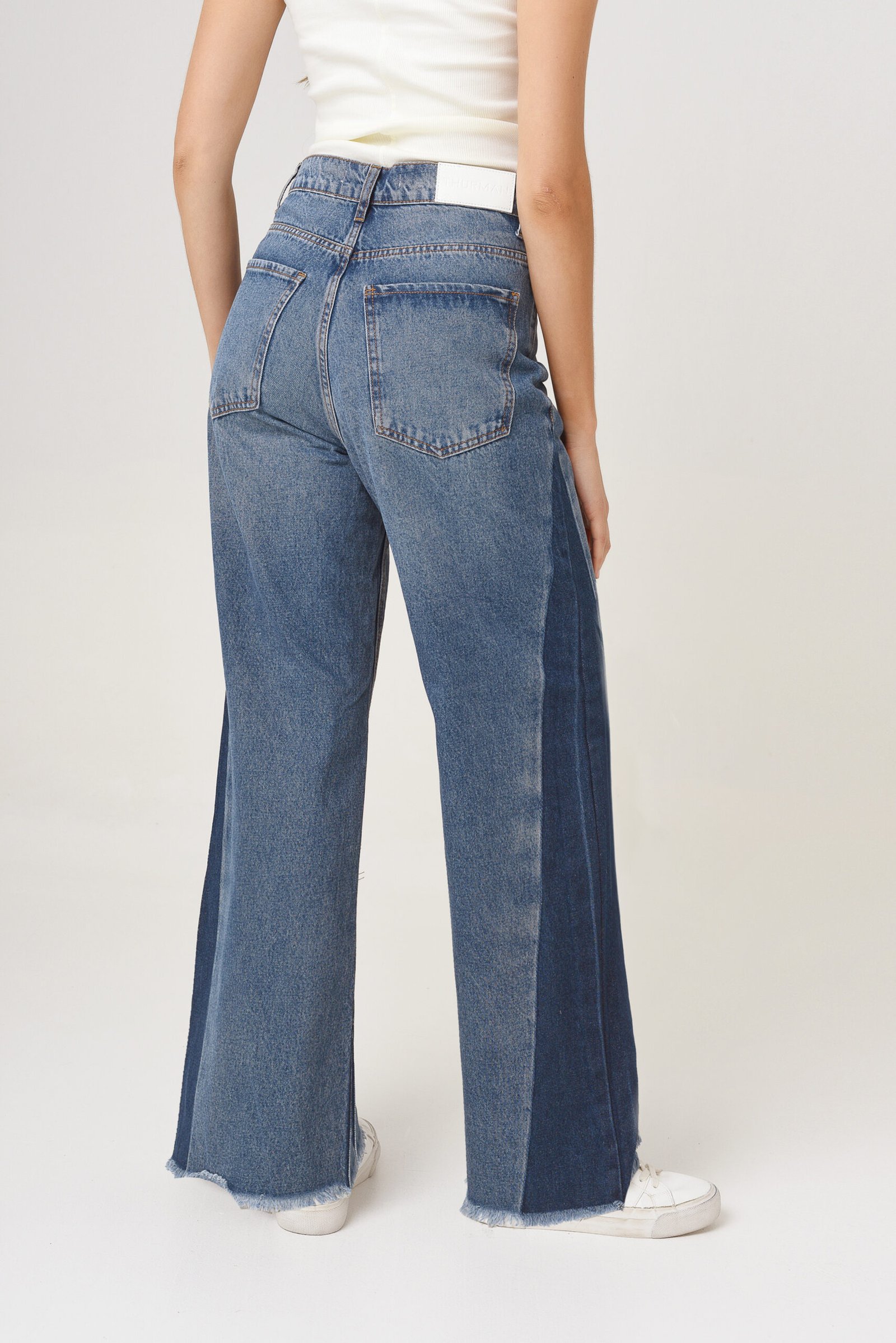 Tiro alto, ajuste en cintura, cadera y muslos. Pierna ancha de muslo a botamanga.