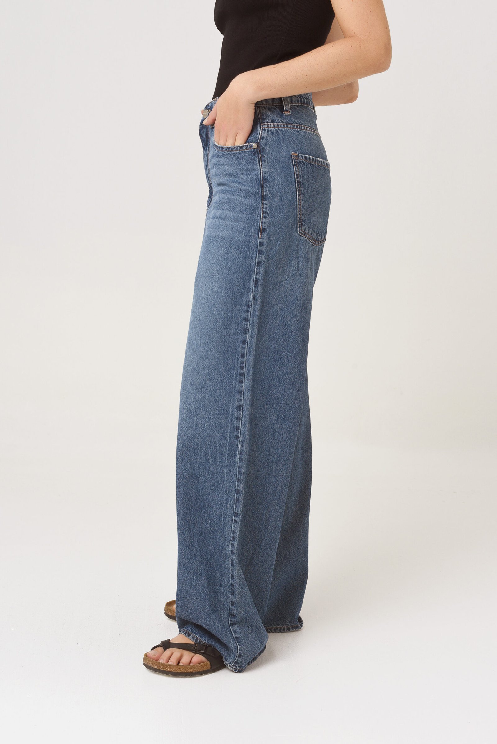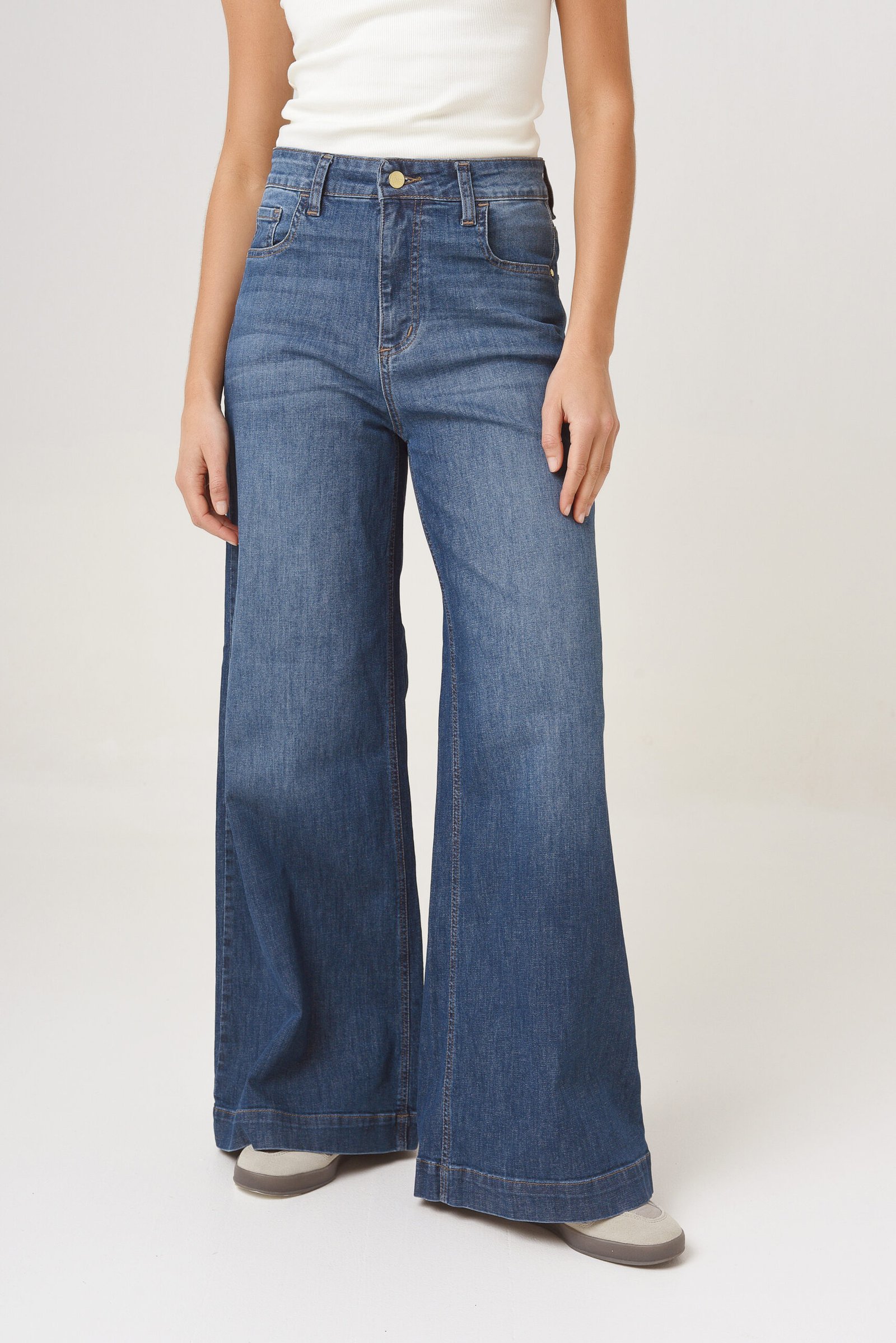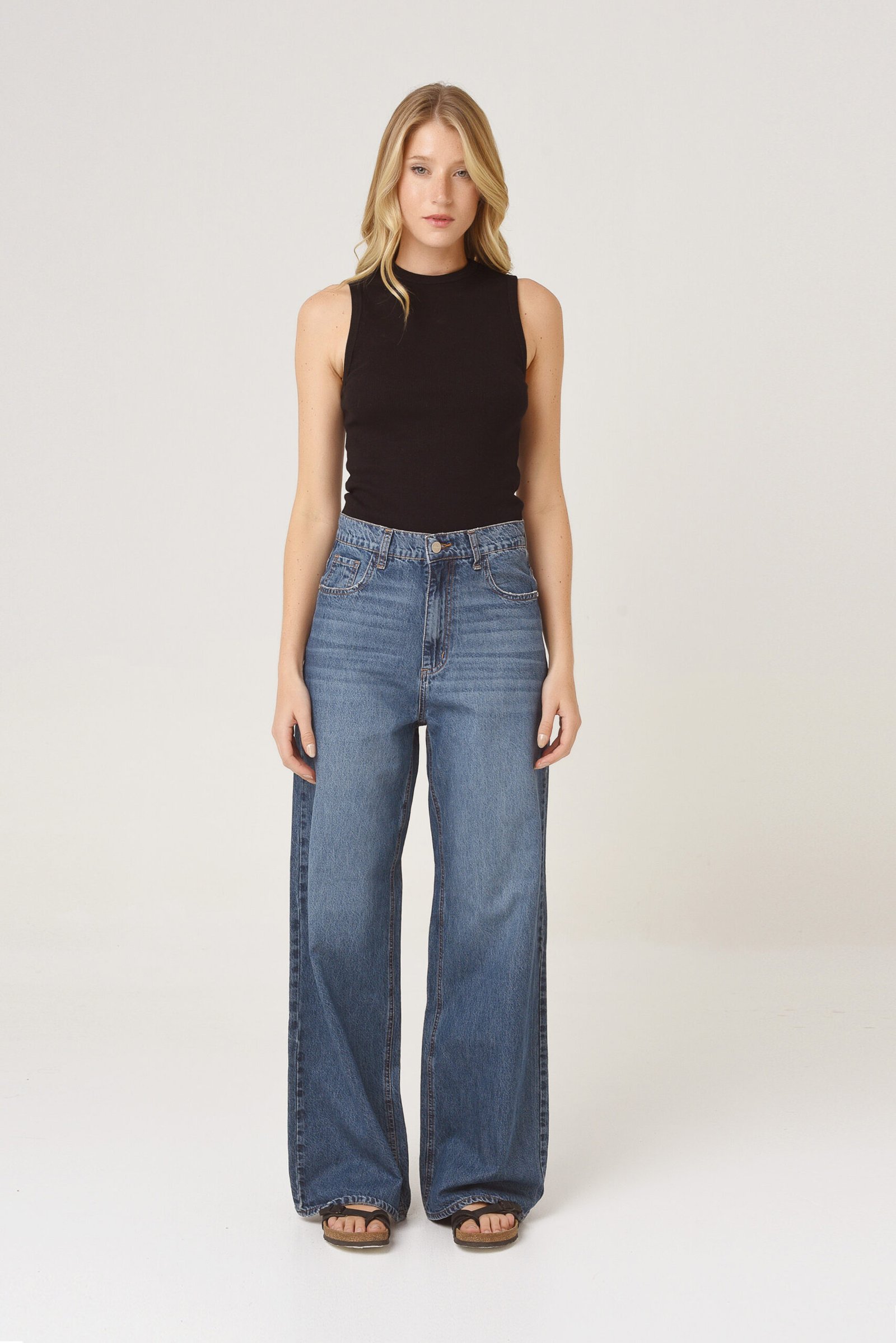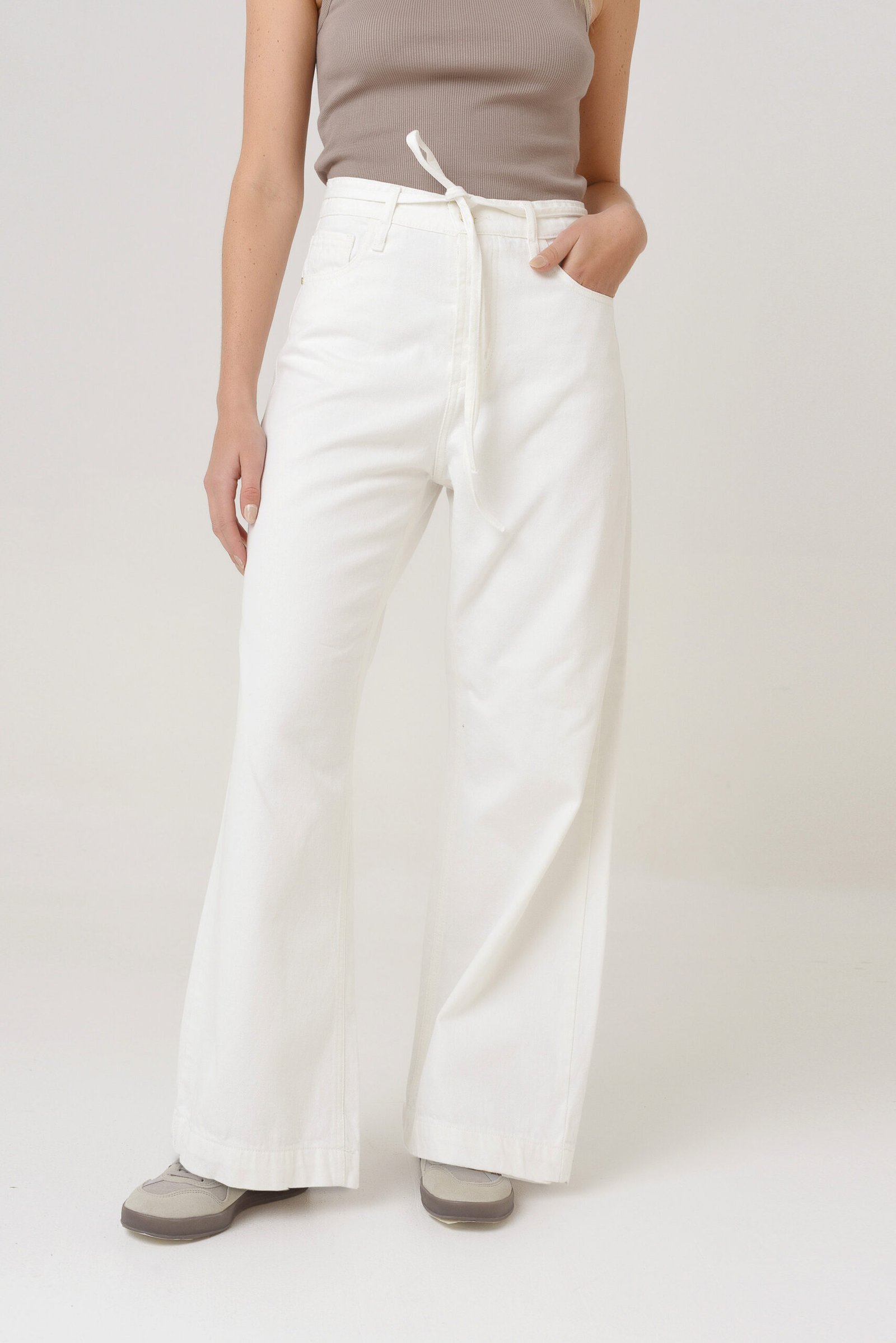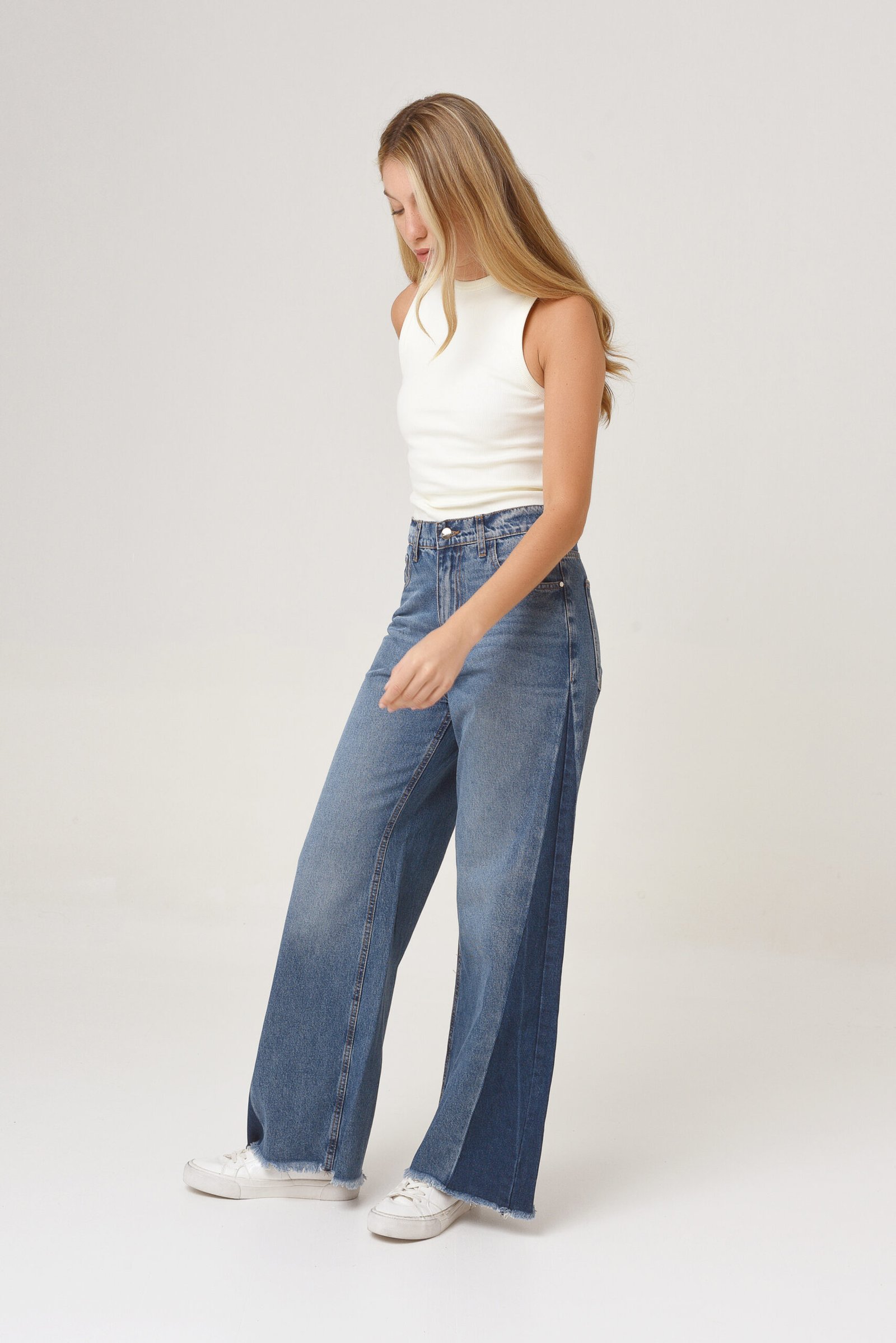 Tiro alto, ajuste en cintura, cadera y muslos. Pierna ancha de muslo a botamanga.