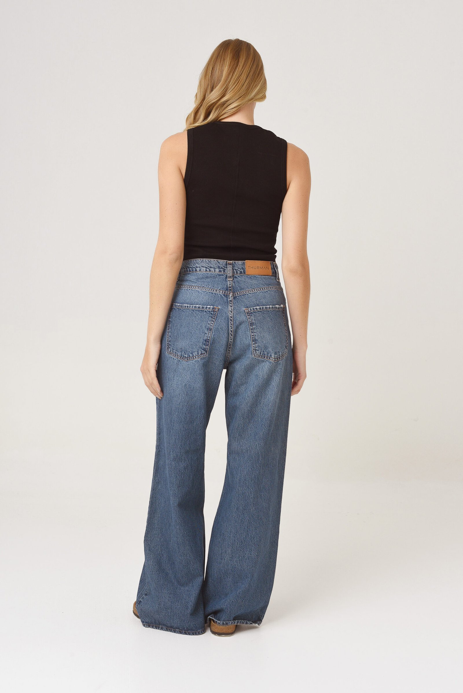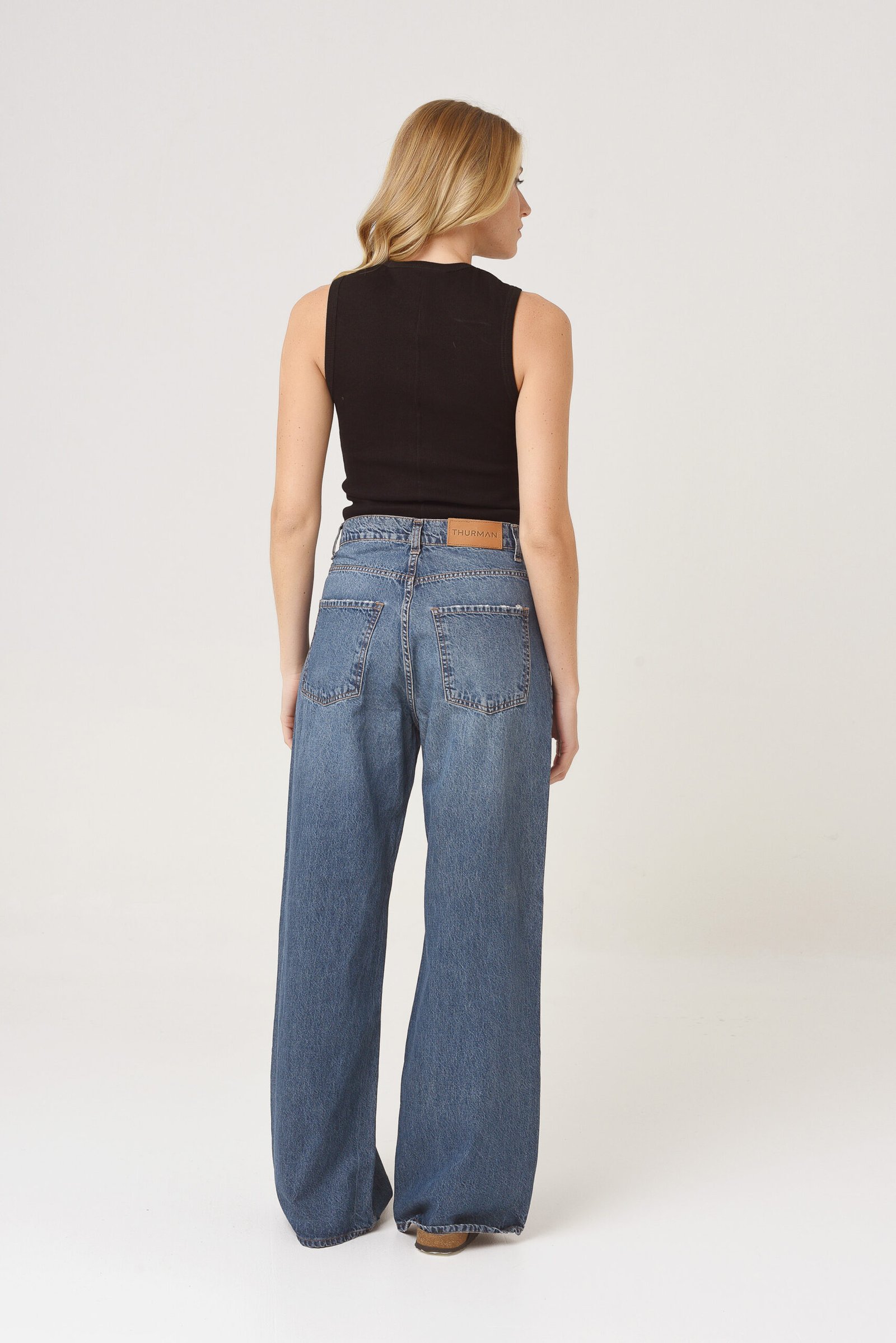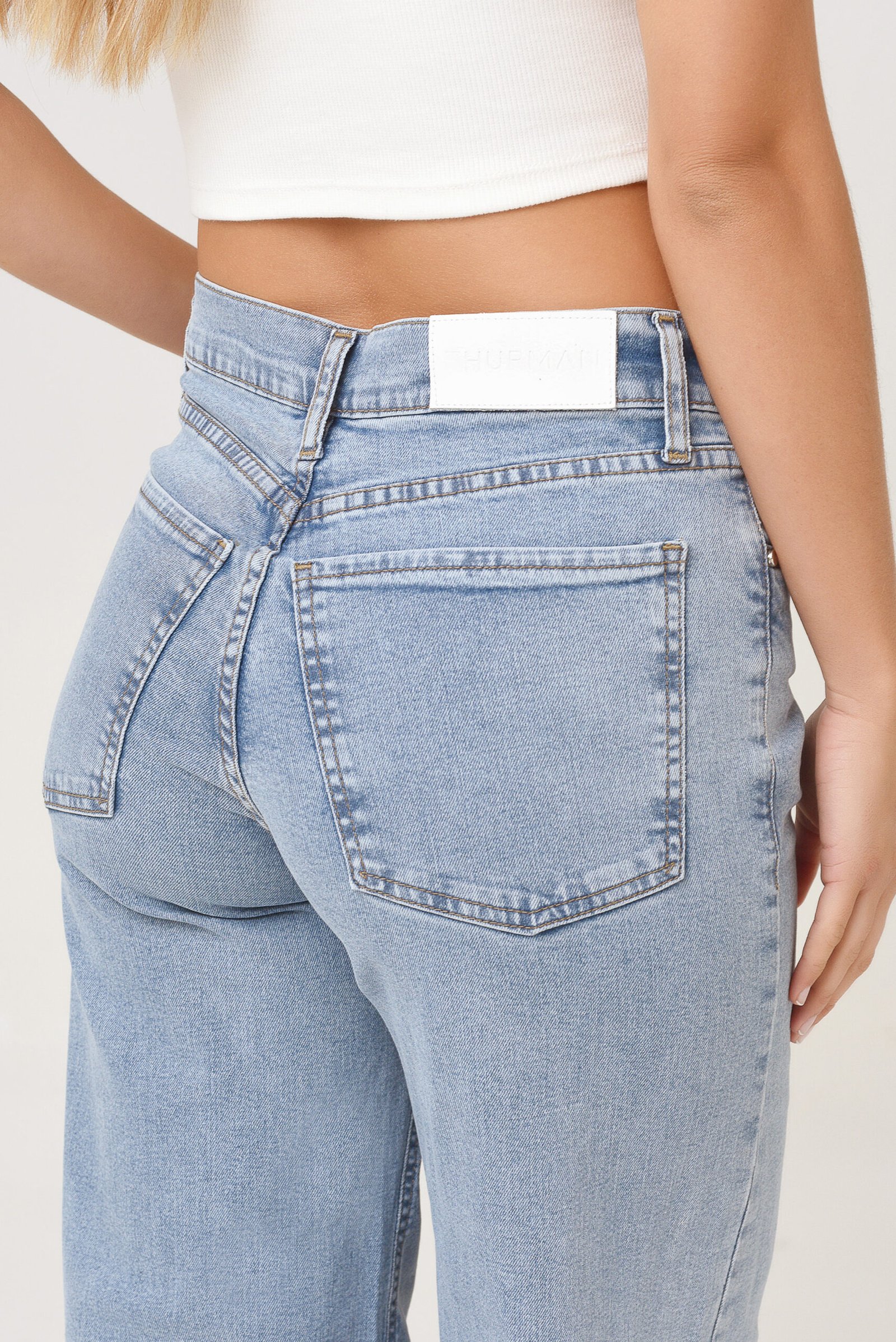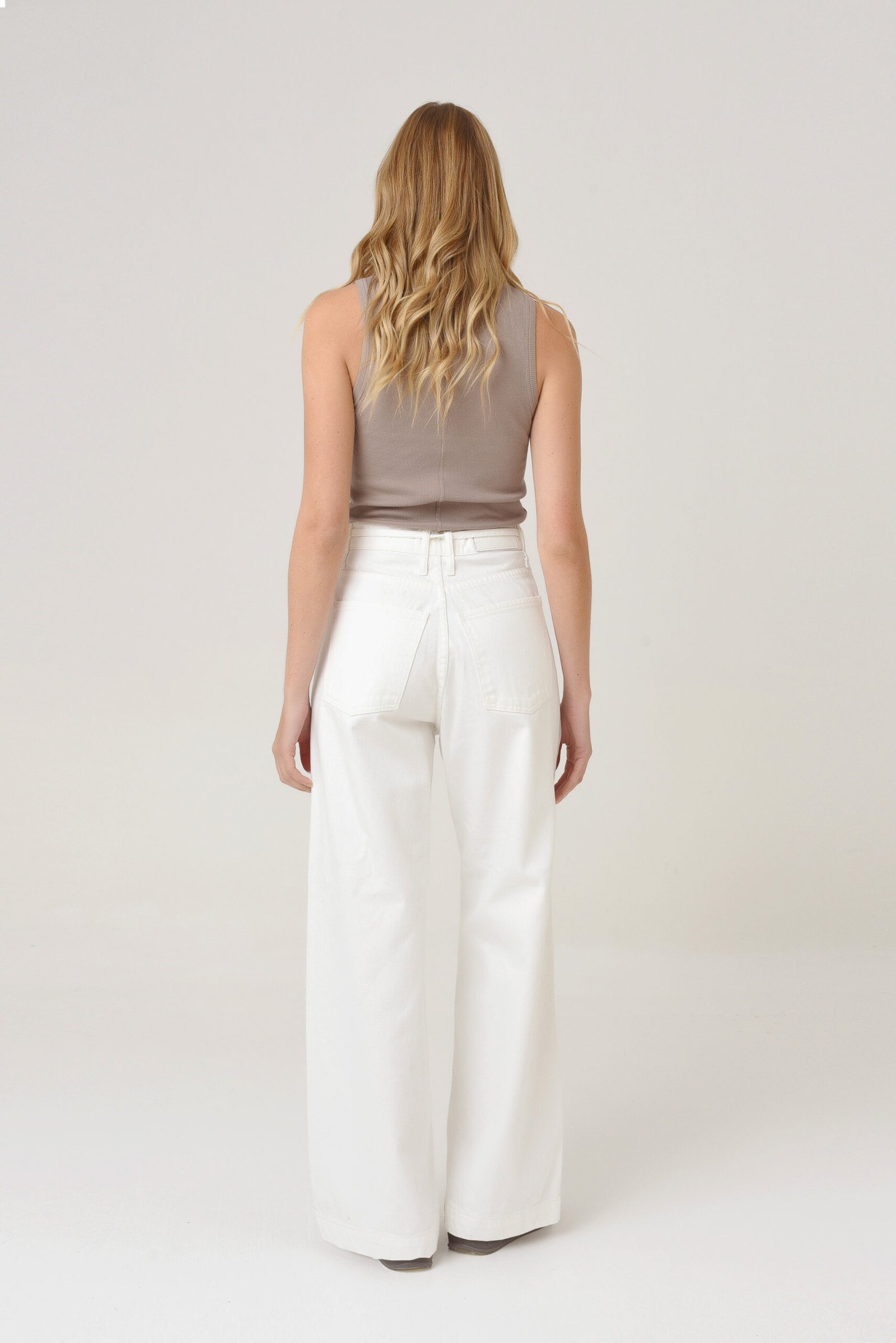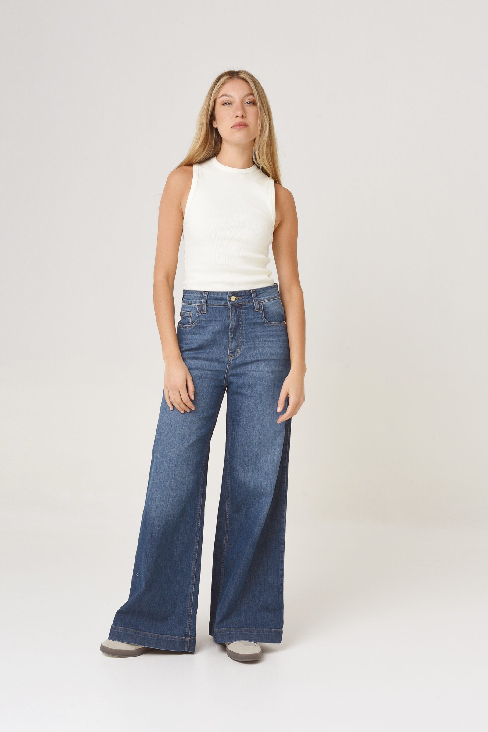 Tiro alto, ajuste en cintura, cadera y muslos. Pierna ancha de muslo a botamanga.