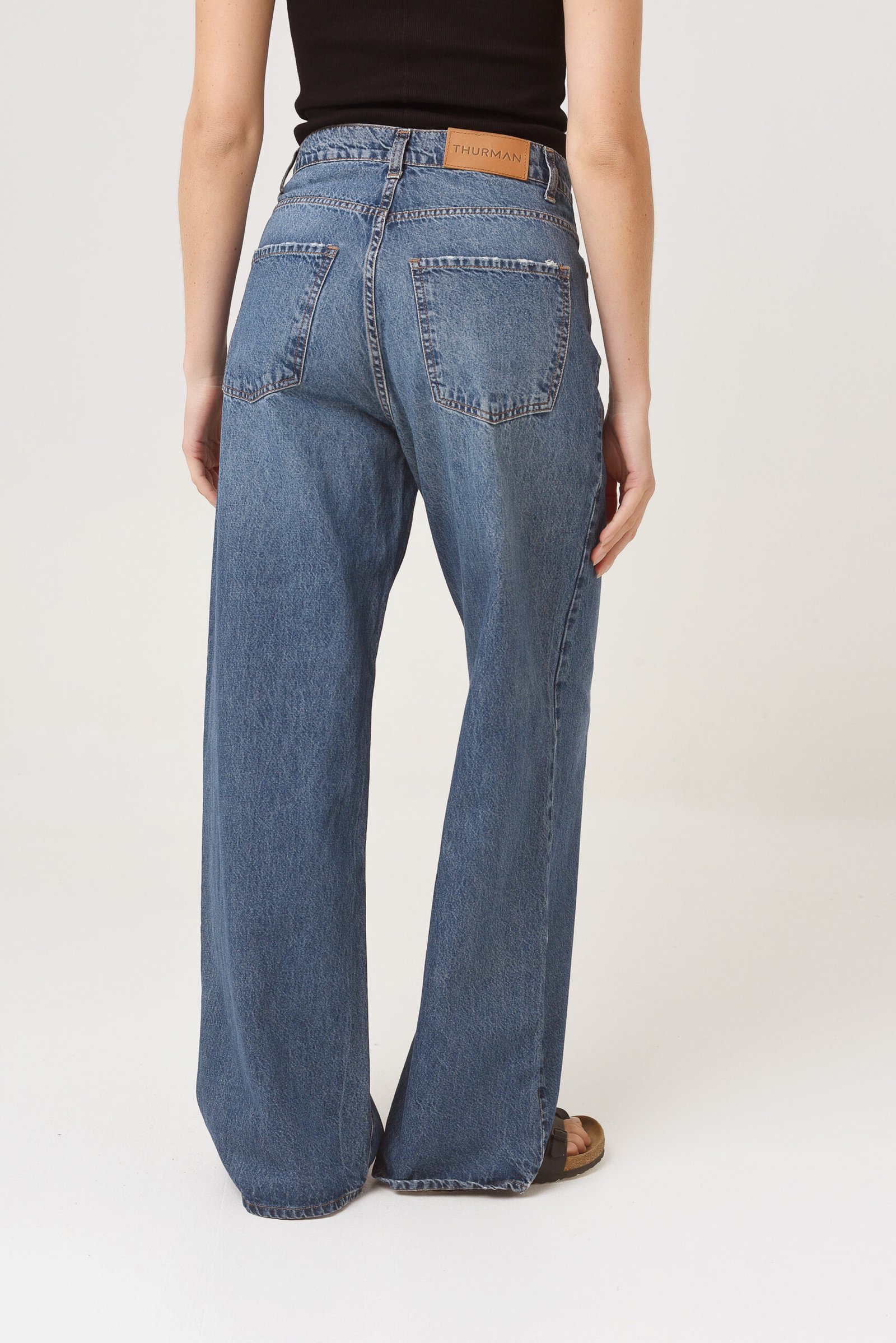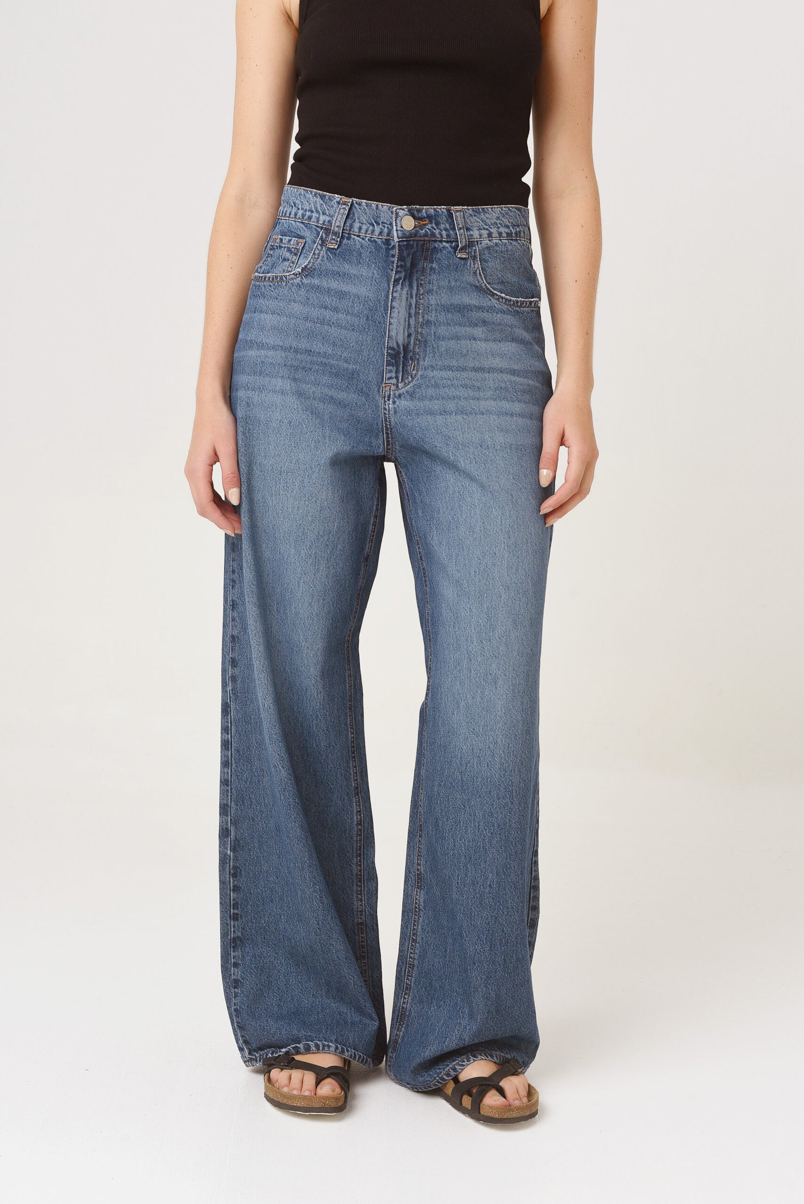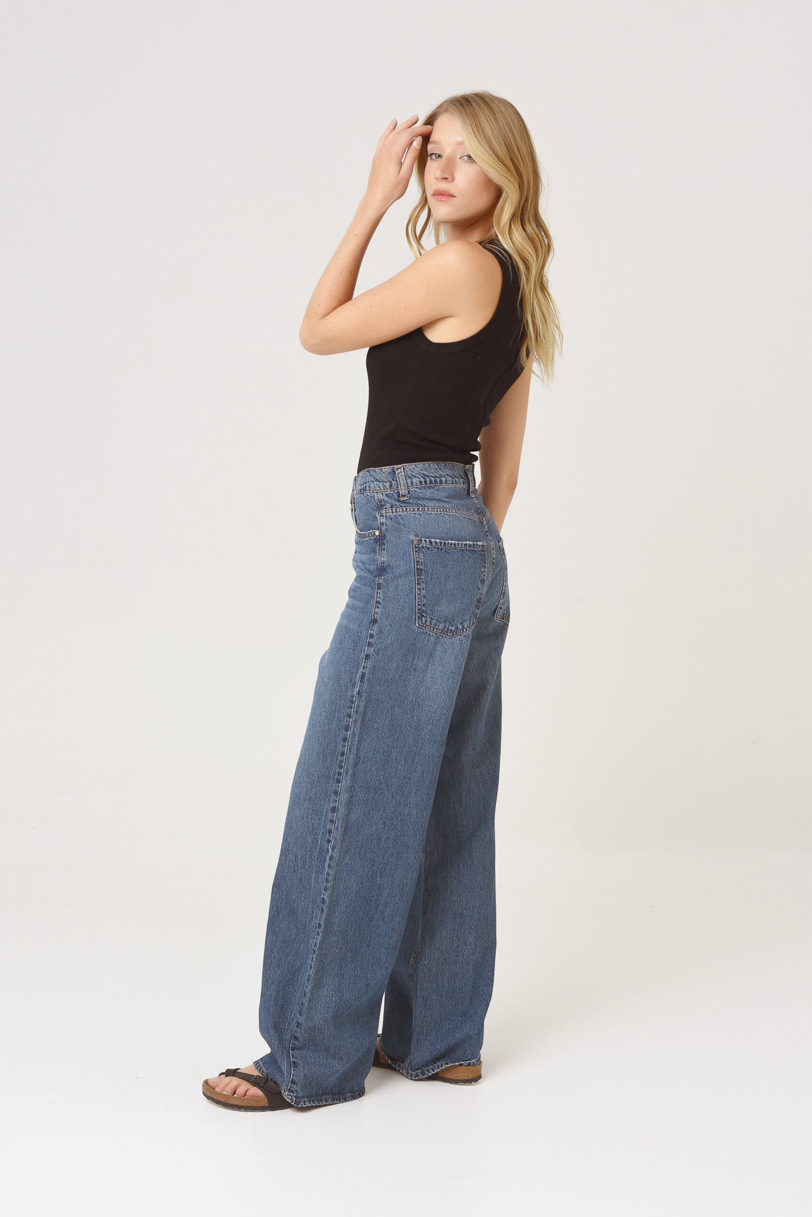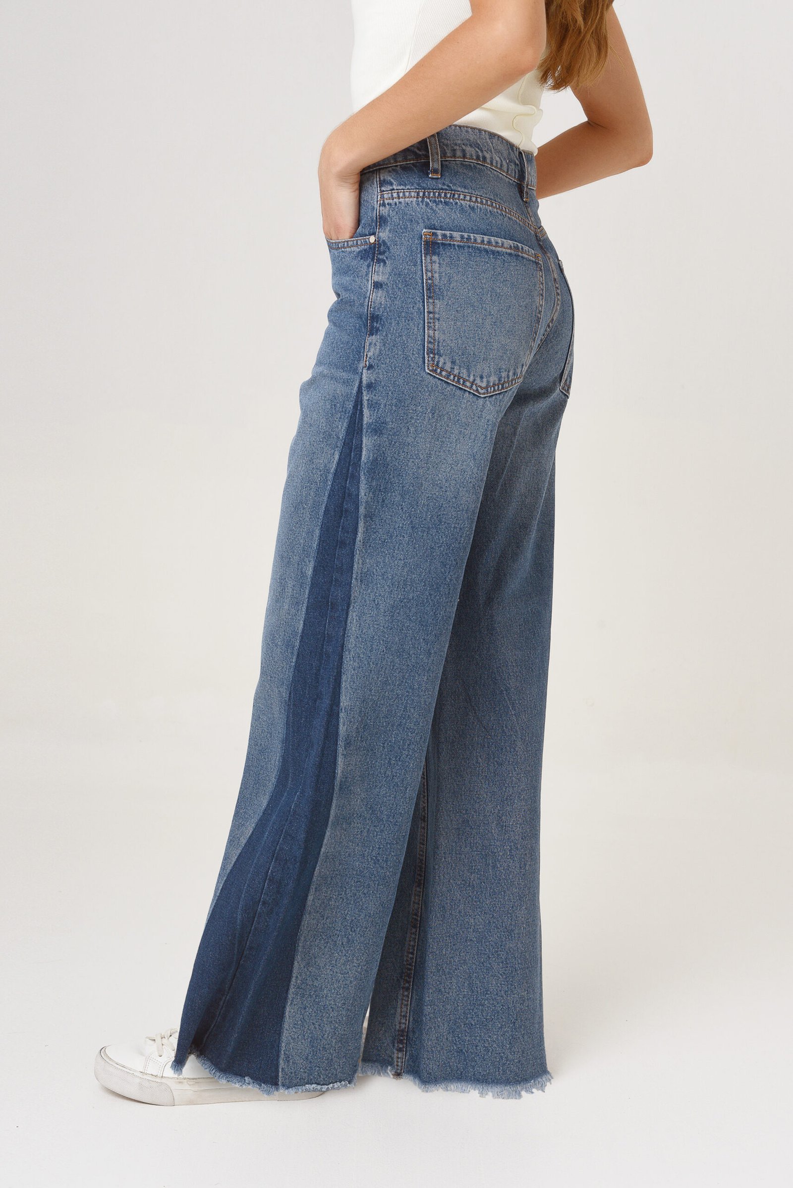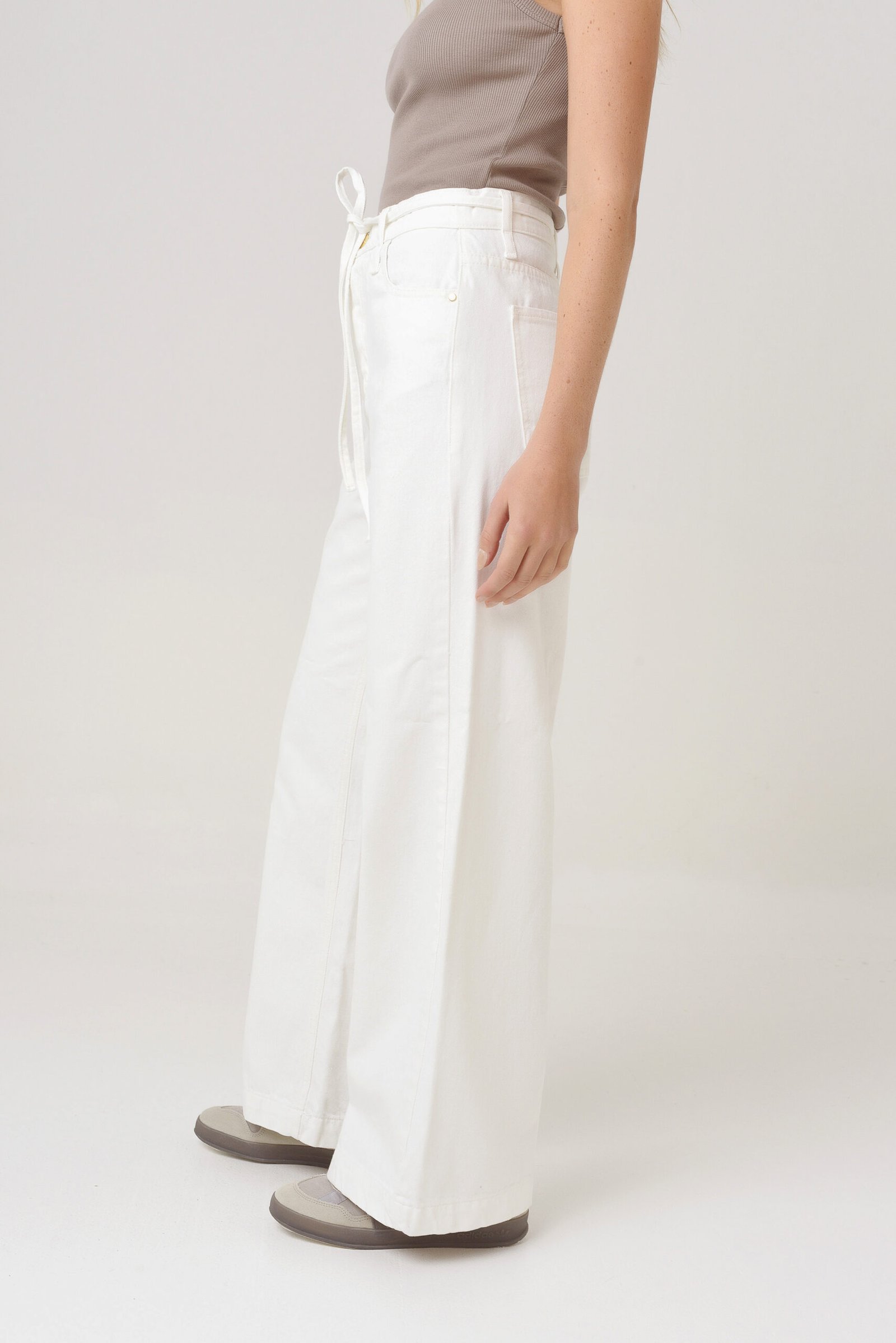 Tiro alto, ajuste en cintura, cadera y muslos. Pierna ancha de muslo a botamanga.