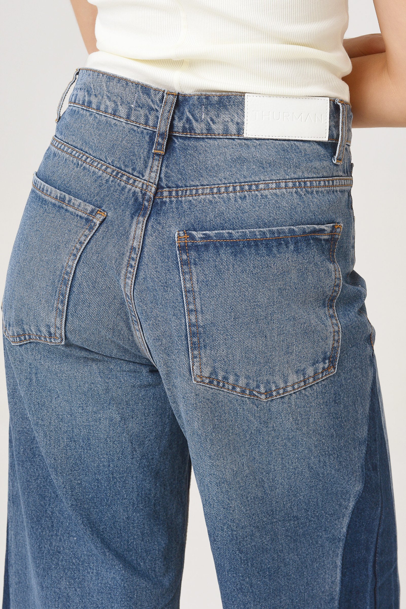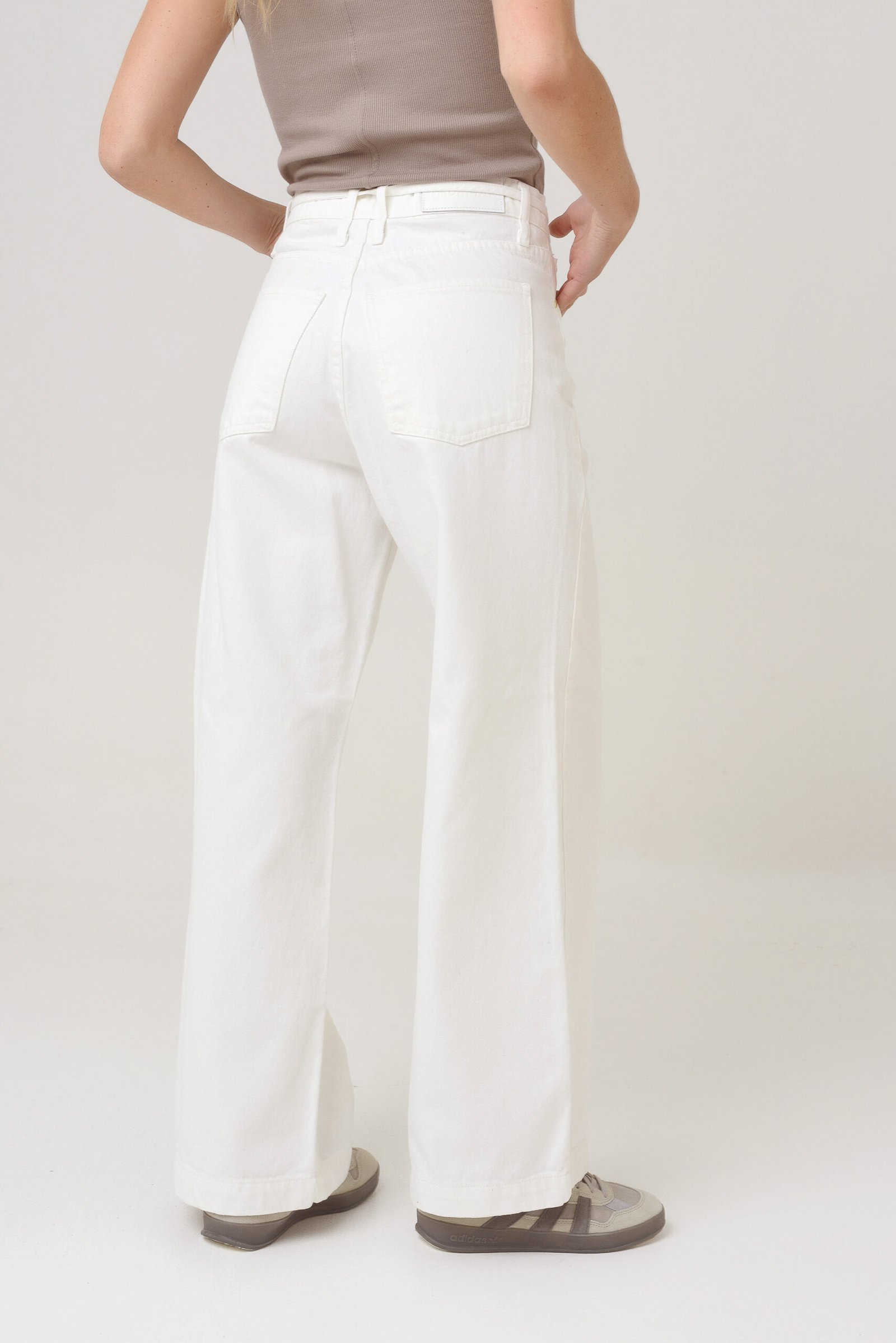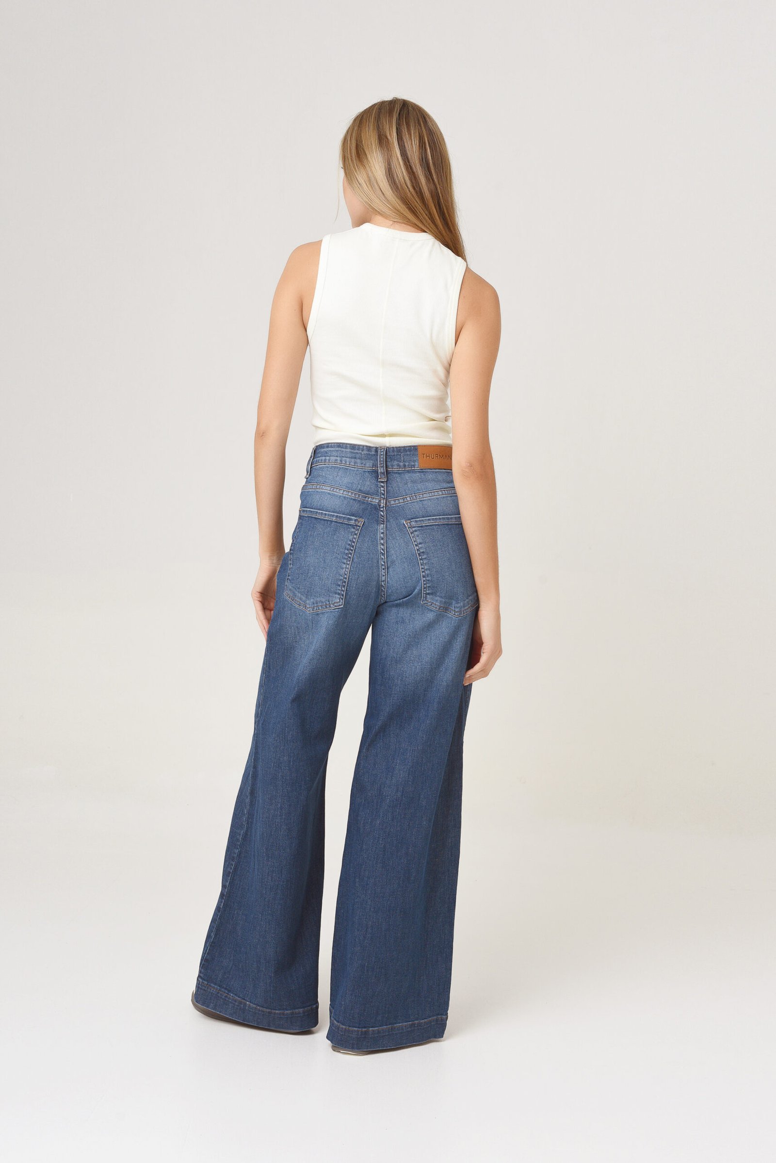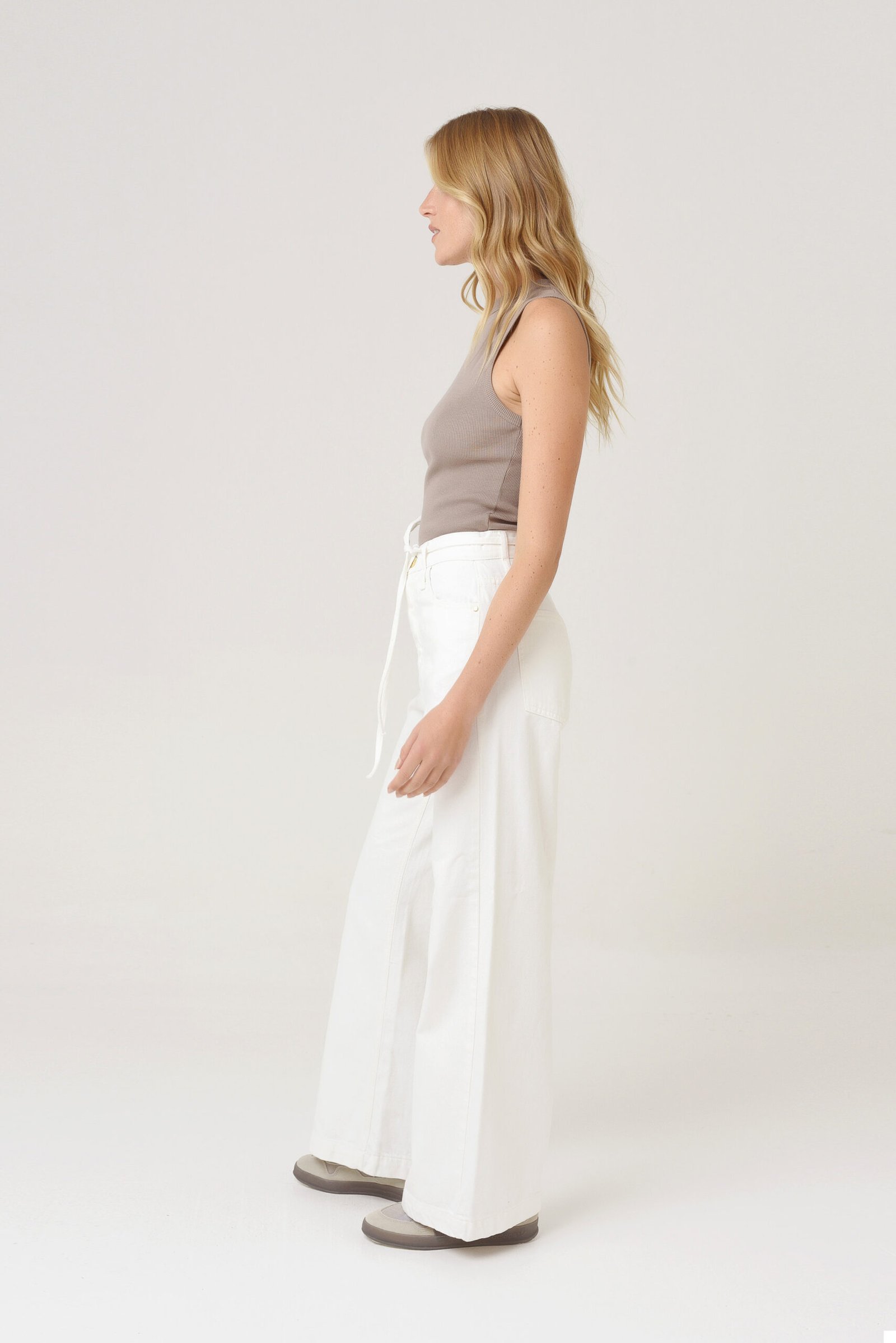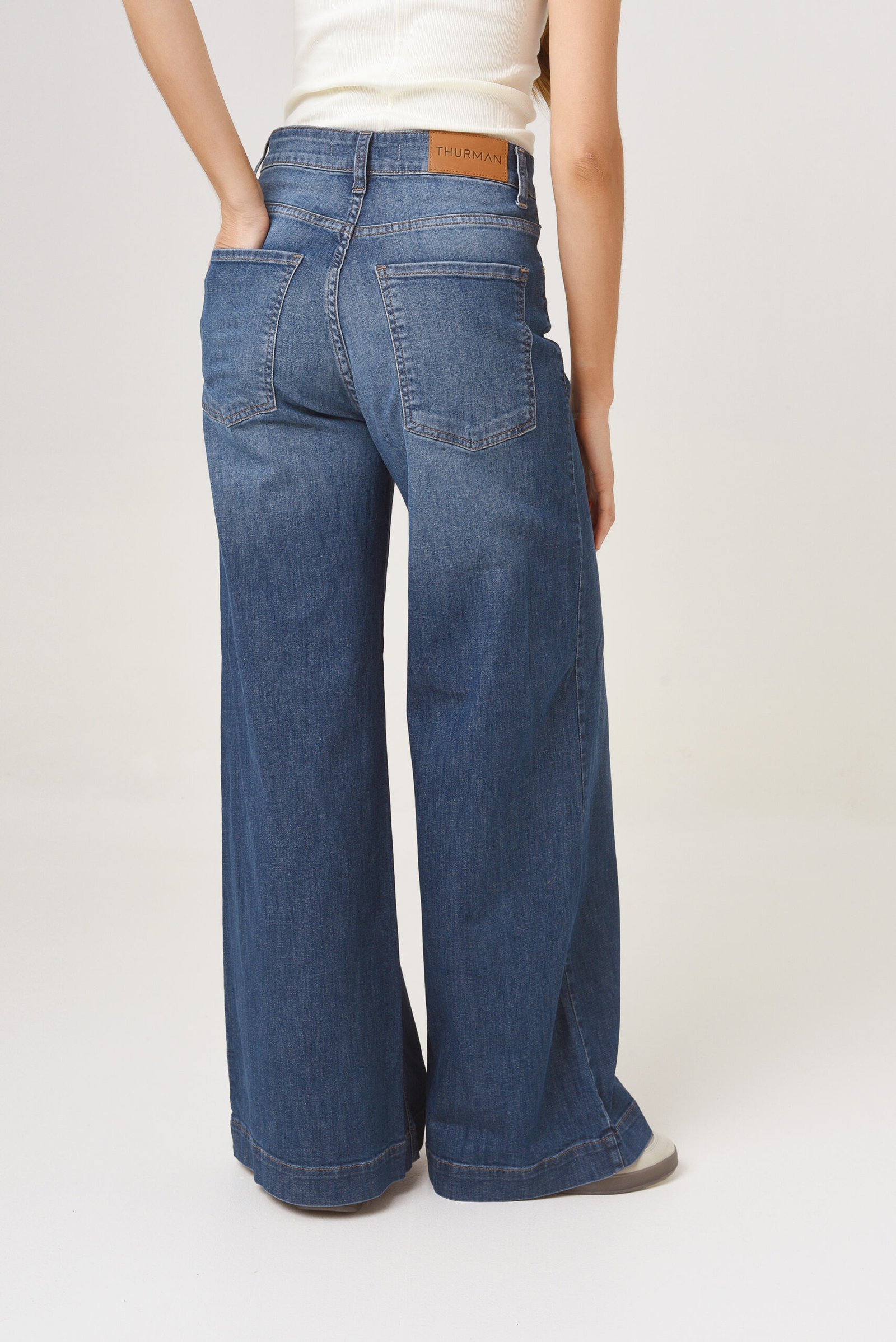 Tiro alto, ajuste en cintura, cadera y muslos. Pierna ancha de muslo a botamanga.