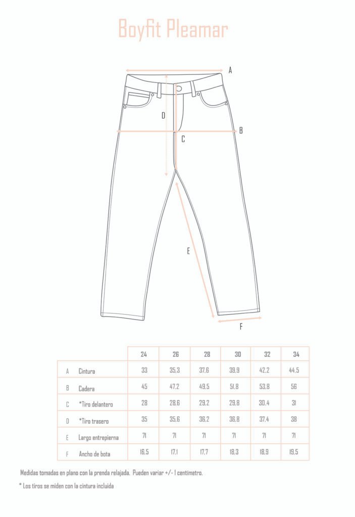 PLEAMAR tiene 5 bolsillos, es tiro medio, y ajusta en cadera y muslos, con leve holgura en piernas.