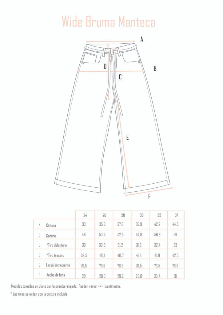 Su pierna es ancha de muslo a bota, su largo es full. Acceso con cartera con botones escondidos.